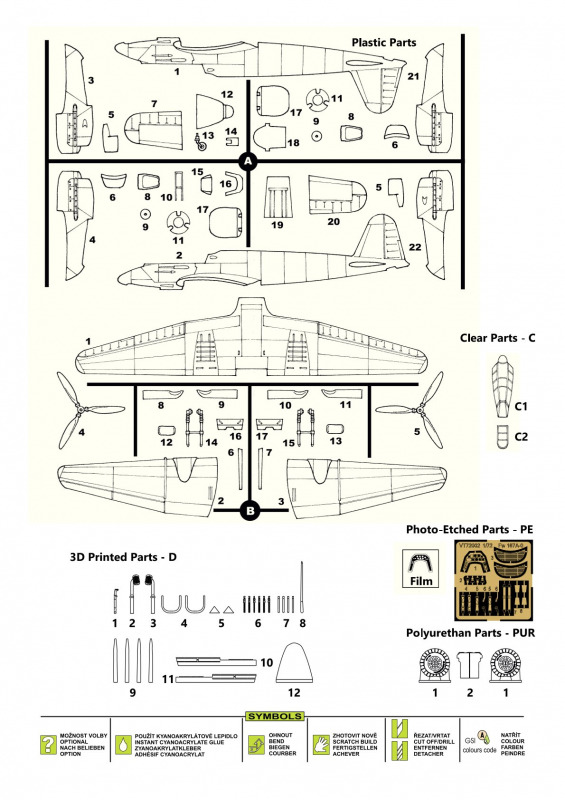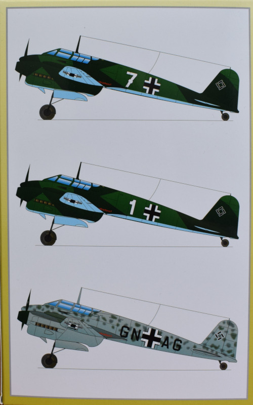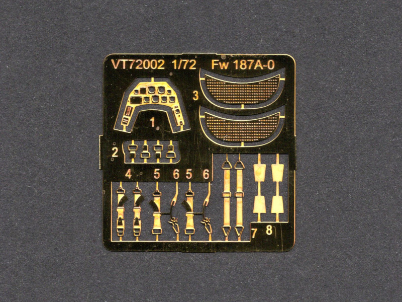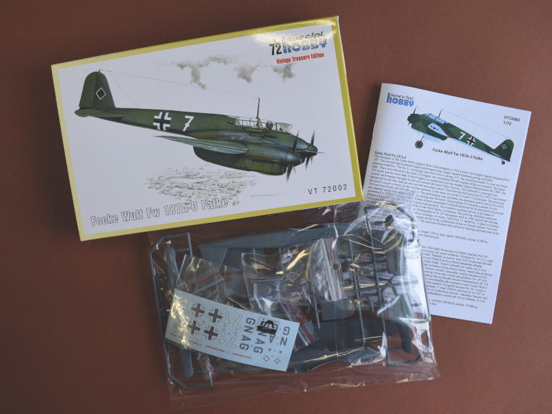 Die Fw 187 im ModellbauErste Modelle einer Fw 187 gab es seit etwa Mitte der 1970er als Vaku-Bausätze in 1:72. Ende der 1980er Jahre folgte ein erster Spritzgußbausatz vom deutschen Kleinserienhersteller Karo As. Ab 2003 lieferte Special Hobby einen neuen Bausatz. Dieser wurde 2025 mit aufgewerteten Teilen wieder neu aufgelegt. Mit HML bietet ab Ende der 1990er Jahre ein einziger Hersteller eine Fw 187 im Maßstab 1:48 an. Alle anderen Maßstäbe sind bis heute noch nicht berücksichtigt worden. Der Bausatz von Special HobbySpecial Hobby nutzt die neue „Vintage Treasure Edition", um ältere Bausatz mit neuem Zubehör nochmals in den Handel zu bringen. Ein Vergleich mit der Erstauflage zeigt, dass die Spritzrahmen unverändert geblieben sind. Die versenkten Gravuren sind für ein Modell in diesem Maßstab angemessen breit bzw. tief. Unsauberkeiten sind nur minimal vorhanden. Passzapfen und optionale Ruder- oder Landeklappen sind nicht vorhandeln. Die Klar- und Resinteile sind jeweils separat in Zippbeuteln verpackt. Die Klarteile sind angenehm dünn hergestellt. Die Ätzteilplatine ist neu angeordnet und deutlich kleiner als in der Erstauflage. Die wichtigen Teile für die Kühler, Sitzgurte und das Instrumentenbrett sind aber vorhanden. Die 3D-gedruckten Teile ersetzten einige der Spritzgussbauteile. Die nicht benötigten Teile sollte man vor Baubeginn aussortieren, damit es nicht zu Verwechslungen kommt. Das Stück Fotofilm ist für das Instrumentenbrett bestimmt. Auf den aus Resin gegossenen Reifen kann man auch die Beschriftung noch lesen.