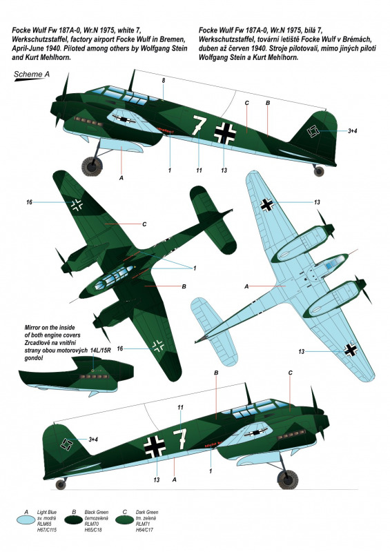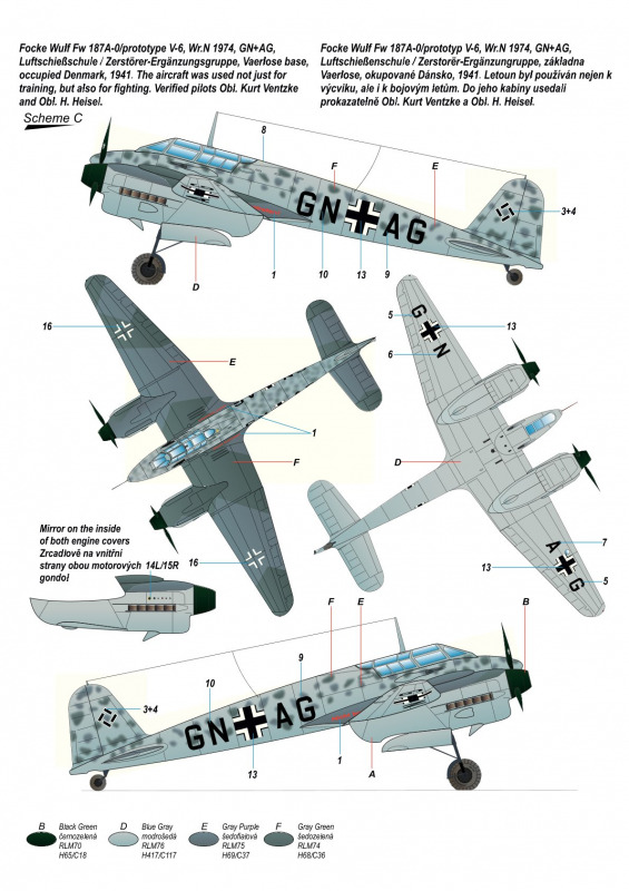 Besprechung:Das OriginalNach dem Focke-Wulf bei der Ausschreibung zum deutschen Standardjagdflugzeug mit der Fw 159 gegen die Bf 109 nicht gewinnen konnte, begann die Firma - ohne eine offiziellen Entwicklungsauftrag - mit den Plänen an einem zweimotorigen Jagdflugzeug mit kleinstmöglicher Zelle und den damals stärksten Triebwerken. Diese Pläne wurden dann dem RLM vorgelegt und anhand dieser Spezifikationen Ende 1935 der Bau von drei Prototypen genehmigt. Im April 1937 hatte die Fw 187 V-1 ihren erfolgreichen Erstflug. Später erhielt sie das Stammkennzeichen D-AXAK. Die Flugerprobung zeigte, dass der „Falke" um etwa 40 km/h schneller war als die Bf 109, hatte eine deutlich größere Reichweite und Zuladung. Die V-2 (D-AANA) hatte im Juni 1937 ihren Erstflug und die V-3 (D-AODE) im September 1938. Alle drei Maschinen waren Einsitzer. Aus Platzgründen wurden die Triebwerküberwachungsinstrumente in die Motorengondeln eingebaut. Da die geplanten DB 600 Motoren noch nicht verfügbar waren, wurden Jumo 210 mit weniger Leistung verwendet. Da mit diesen Motoren die strömungswiderstandsarme Heißkühlung zu dieser Zeit nicht möglich war, wurden diese mit konventionellen Luftkühlern versehen. Jedoch verringerte sich dadurch die Geschwindigkeit. Das Leistungsspektrum der Maschine war so groß, dass Einmotorflug und sogar Steigflug oder Durchstarten mit nur einem Motor möglich waren. Die Steigleistung war gleich mit der späteren Fw 190, die sich später als eines der besten einmotorigen Jagdflugzeuge der Welt erweisen sollte. Im Mai 1938 wurde der weitere Bau der Einsitzer eingestellt und statt dessen gab es vom RLM eine Ausschreibung zu einem „Zerstörer" mit zwei oder drei Mann Besatzung. Focke-Wulf passte die Konstruktion an und erhielt den Auftrag, fünf weitere Maschinen zu bauen. Da aber inzwischen die Ausschreibung an die Bf 110 vergeben worden war, war das Interesses des RLM an der Fw 187 nur noch gering. Die neu gefertigten Zweisitzer wurden als Fw 187 A-0 bezeichnet. Da die Maschinen nie offiziell bei der Luftwaffe geführt wurde, wurden sie zu einer „Industrie-Schutzstaffel" zusammengefasst. Als Piloten fungierten die Testpiloten von Focke-Wulf. Einsätze gegen feindliche Flugzeuge oder gar Abschüsse sind nicht bestätigt. Für Waffentests wurden einzelne Maschinen nach Dänemark verlegt. Es gab Umbauten und Pläne zu einer B- und C-Serie, aber diese Maschinen wurden entweder teilfertig verschrottet oder bei Unfällen zerstört. Es gab auch Überlegungen für einen Nachtjäger und eine Stuka-Variante. Nach Mitte 1944 gibt es keinen Nachweis mehr über Flüge mit einem „Falken". Die Fw 187 verfügte zu Beginn des Zweiten Weltkrieges über ein hohes Potential, welches aber durch politische und stellenweise persönliche Machtspiele vergeudet wurde.