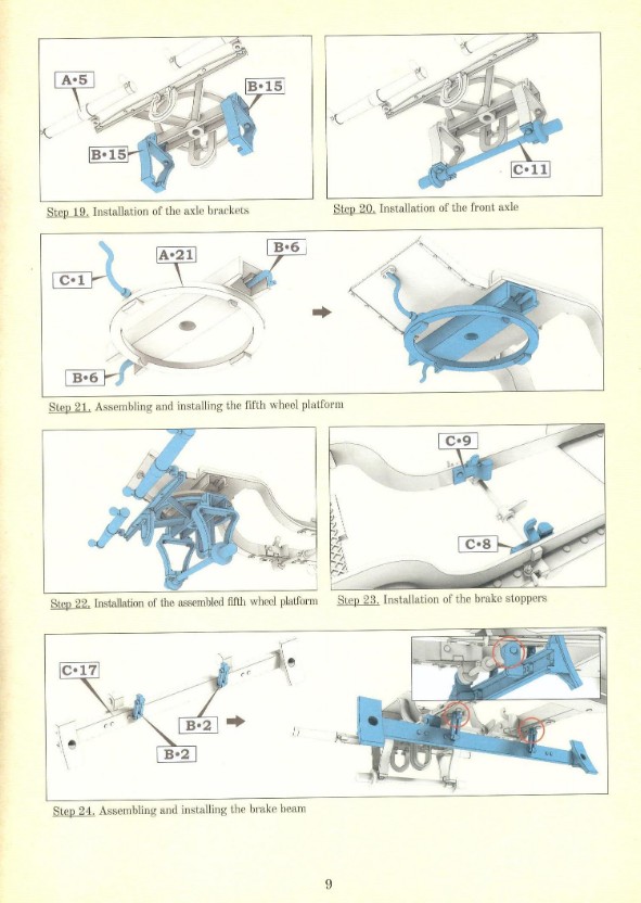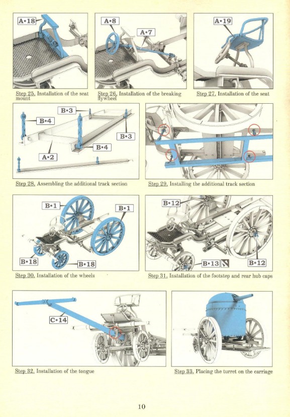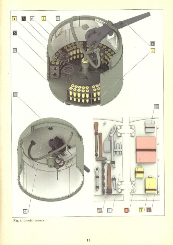 Der BauplanAuf 14 Seiten eines sehr ansprechenden, handlichen Heftes im Format 196 mm x 277 mm werden neben einem historischen Text (S.3, englisch) und fünf historischen Photographien (S.4) nach einer Teile- und Farbübersicht (S.5) die 33 Baustufen vorgestellt. Übersichtlichkeit ist hierbei Trumpf, wenig zu verbauende Teile pro Bauschritt, Führung über Icons und farbliche Hervorhebungen für anzubringende Teile sorgen dafür. Die Farbdarstellungen des Innenraums vom Fahrpanzer (S.11) und der Außenansicht der Fahrzeuge (S.12) sind vorbildlich.