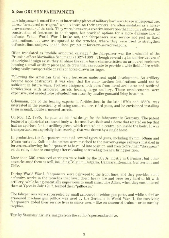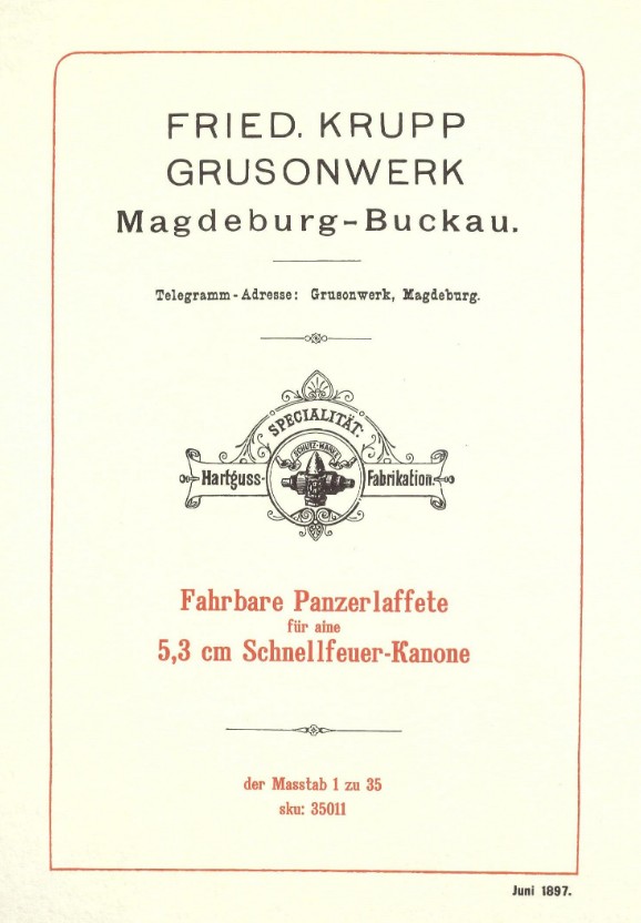 Mit einer modernen Vorstellung von einem Panzer als Kettenfahrzeug tut man sich schwer, wenn man sich dem Phänomen Gruson-Fahrpanzer bzw. „Fahrbare Panzerlaffete für aine 5,3 cm Schnellfeuerkanone“ (Titelblatt des Bauplanheftes im Stile eines Faksimiles der Fa. Krupp, 1897) annähert. Eigentlich handelt es sich eher um eine Art gepanzerter Unterstand mit Geschütz, der auf Rollen beweglich war, um innerhalb einer Festung oder von befestigten Unterständen vor Feindbeschuss verbunkert in Sicherheit gebracht werden zu können. Die Panzerkuppeln waren um 360° drehbar, bei einer Höhenrichtung der Kanone von +10° bis -5°. Für Aufklärung und Daten zur Feuerleitung sorgten Beobachtungstürme und Fesselballone, später auch erste Flugzeuge. Das „Fahrzeug“ wurde 1890 bei den kaiserlichen Truppen für den Dienst in Grenzfestungen eingeführt – nach dem Hersteller, der Fabrik des Hermann Gruson (bei Magdeburg) benannt, das ab 1893 von Krupp übernommen wurde und dann unter Gruson-Krupp firmierte. Der Panzerturm auf Rollen wurde schnell zum Exportgut der Rüstungsindustrie im ausgehenden 19. Jahrhundert. Zum Transport der „Fahrpanzer“ wurden spezielle Transportwagen für Pferdezug benutzt, auf denen 600 mm-Schienen zur Aufnahme der Panzerzürme dienten. Auf Schienen dieser Spurweite konnte der „Fahrpanzer“ gezogen und/oder geschoben werden. Dabei dürfte es sich allerdings nur um kurze Distanzen gehandelt haben wie z.B. zwischen Feuerstellung und verbunkertem Unterstand. Der Panzerturm ursprünglich für den Einsatz in Festungen geplant, folgte im Ersten Weltkrieg dem Kriegsgeschehen bald in die Schützengräben. Die letzten Exemplare des Gruson-Fahrpanzers waren wohl in Schweizer Festungswerken (z.B. Hospizwerk San Gottardo, Forte Airolo) verbaut und wurden nach dem 2. Weltkrieg (1947) nicht mehr genutzt. Das kuriose Fahrzeug kann als ein frühes militärisches Produkt der industriellen Revolution in Deutschland betrachtet werden und ist museal weltweit erhalten (u.a. Brüssel, Athen).
