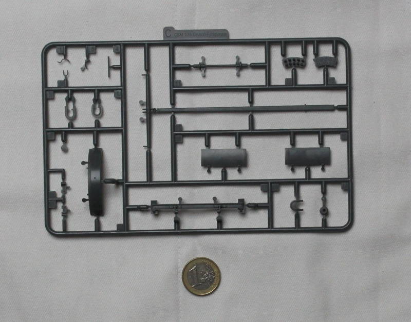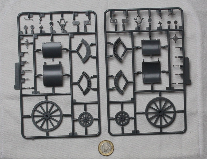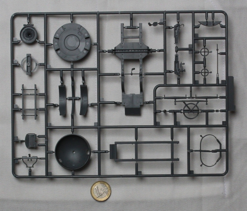 Die wenigen Bauteile des kleinen Modells sind stabil in Karton und sicher in Tütchen verpackt. Sie machen einen hervorragenden Eindruck und zeichnen sich durch eine sehr feine Detaillierung aus. Als Beispiele seien zahlreiche Niete als zeitgemäße Verbindungstechnik des Vorbilds, aber auch die Fahrzeugmechanik der „Kutsche“ genannt. Die Oberflächen des Panzerturms sind vorbildgerecht (Bleche) relativ glatt gespritzt, die Panzerkuppel hat eine sehr feine Struktur. Die Teile B3 und B4 wird ein engagierter Modellbauer womöglich gegen Kettchen austauschen wollen. Trotz aller lobenswerten Feinheiten wirkt der Bausatz mit seinen wenigen Teilen sehr übersichtlich, was an sich kein Nachteil sein muss. Die insgesamt 85 Teile sind auf vier Spritzlingsrahmen verteilt, wobei der Rahmen B zweimal vorhanden ist. Im Einzelnen umfasst der Bausatz: