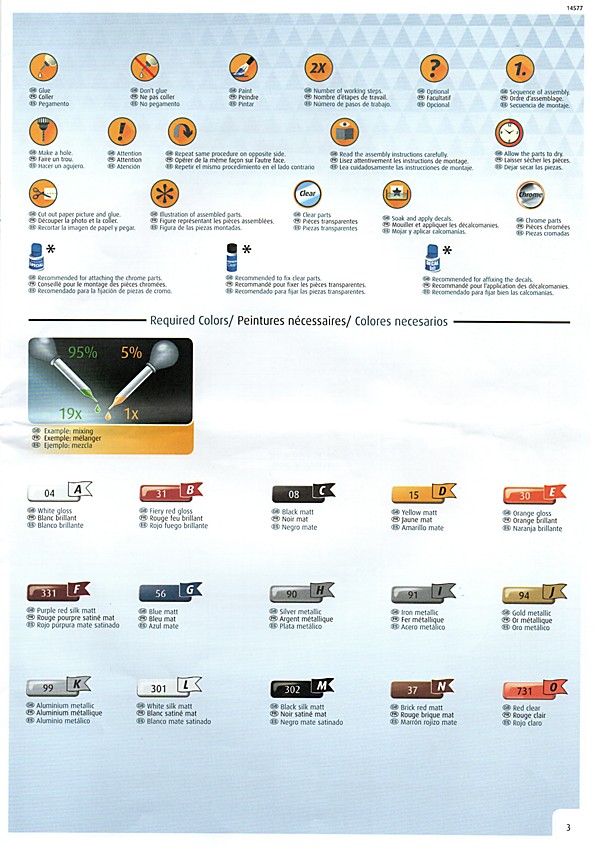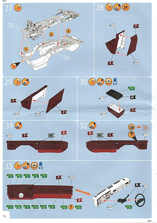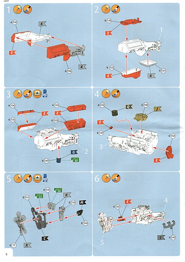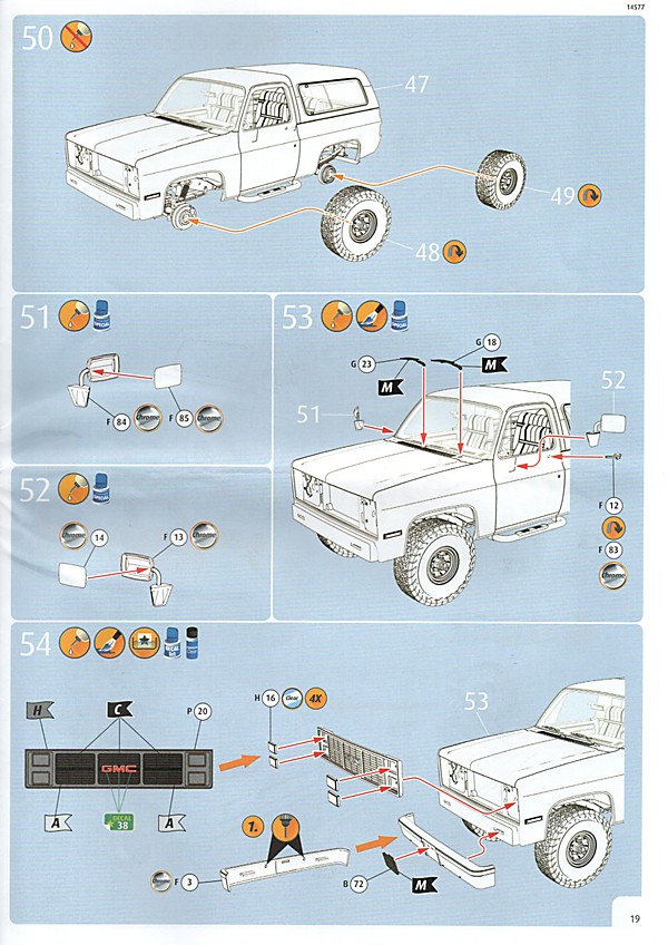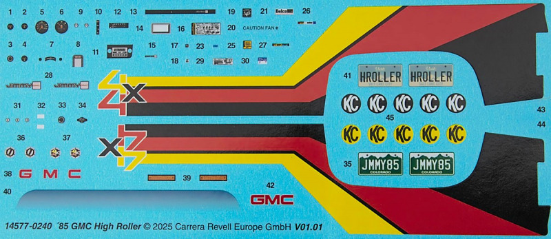 Bei den Revell USA-Bausätzen scheint nun, was die Bauanleitung angeht, die Zeitenwende eingeläutet worden zu sein. Dies ist das erste Mal, dass eine farbige Anleitung beigelegt worden ist. Inhaltlich hat man sich den europäischen Anleitungen angepasst, so gibt es neben der Revell USA-typischen Bauteileliste auch eine Übersicht über die Teilerahmen (mit geschwärzten Teilen, die nicht benötigt werden). Die Bemalungshinweise sind jetzt auch farblich hervorgehoben, so wie man es hierzulande schon länger kennt. Die Baustufen wurden aufgelockert, vorbei sind die Zeiten, wo zum Teil zweistellige Bauteilezahlen pro Baustufe gebraucht wurden. Was es nicht gibt, ist eine Bemalungsanleitung für das ganze Fahrzeug; die entsprechenden Hinweise, welche Decals wo hin gehören, wurden in die einzelnen Schritte integriert. Der Decalbogen ist für so ein aufwändiges Modell recht klein ausgefallen, teilweise liegt das aber an den nur spärlich vorhandenen Zierstreifen und Nummernschildern. Dafür gibt es aber reichlich kleine Schildchen und Embleme, die dem fertigen Modell den letzten Detailkick verschaffen. Eine Sache, die mich bei den Revell USA-Bögen immer wieder stört, ist das sichtbare Druckraster. Bei Metallfarben ist das besonders ausgeprägt, man sieht es aber auch auf den größeren Flächen.