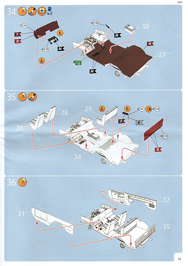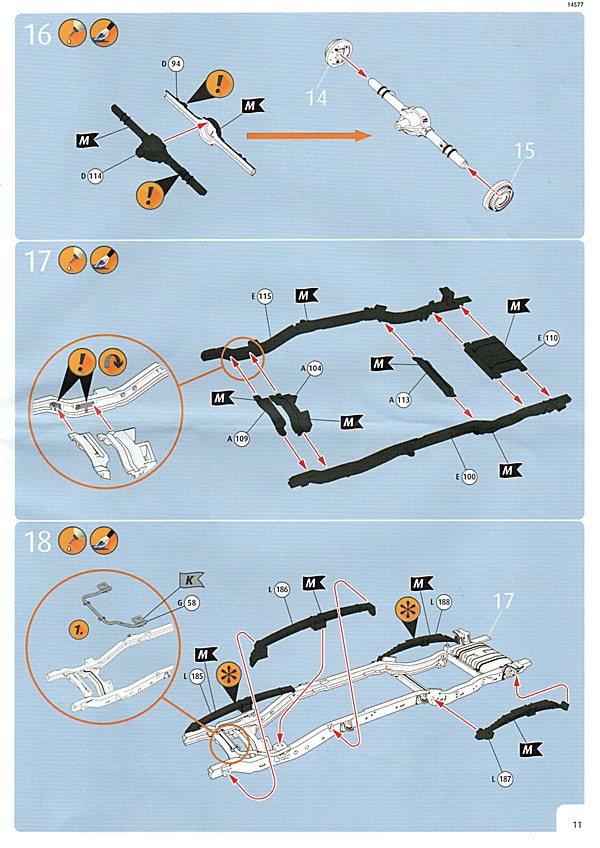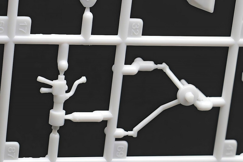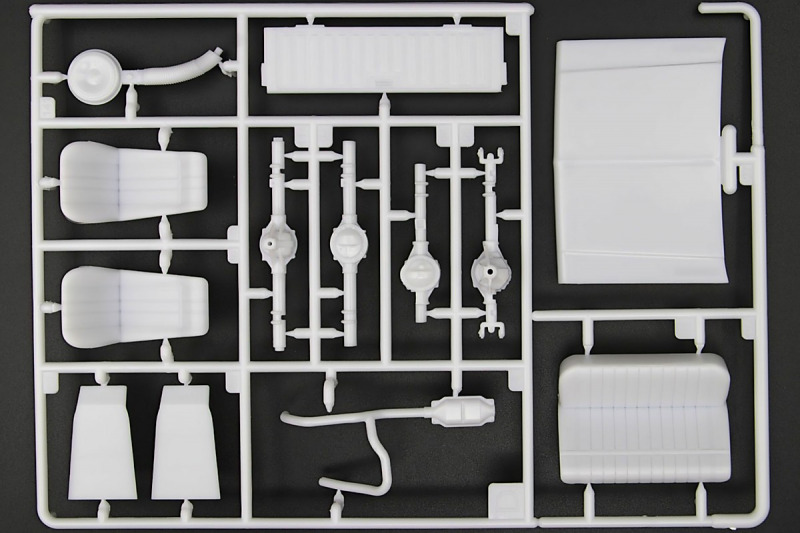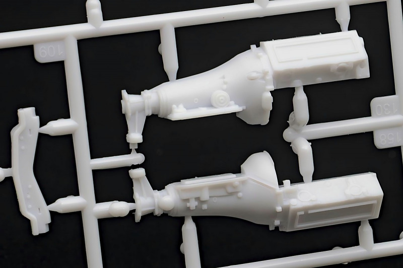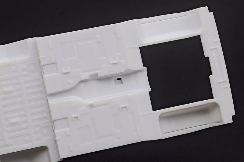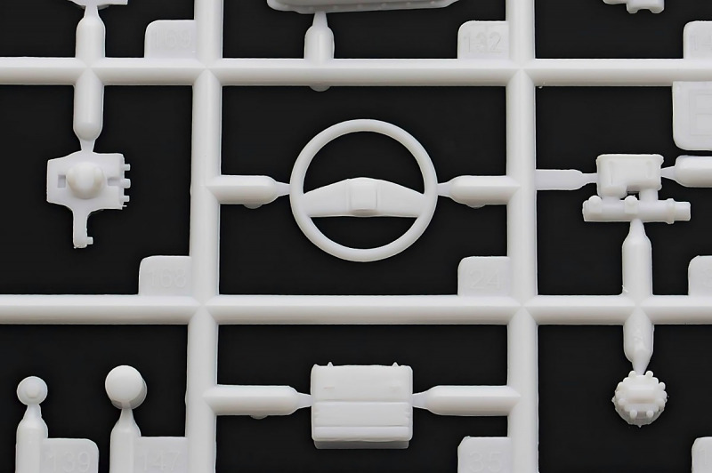 Weiter geht´s mit den Achsen, wie schon erwähnt, kann man sich an der Vorderachse für ein oder zwei Paar Stoßdämpfer entscheiden. Die Räder können drehbar angebaut werden, wer zusätzlich noch einen Lenkeinschlag darstellen möchte, muss improvisieren. Der Leiterrahmen wird aus mehreren Teilen aufgebaut und zusammen mit Fahrwerk und Motor als eigenständige Baugruppe fertiggestellt. Im Innenraum hat sich Revell besonders viel Mühe gegeben, ein ordentliches Ergebnis abzuliefern. Keine "Decal-Details", wie sonst oft üblich, sondern sauber geprägte Details wie z.B. Türgriffe, Lüftungsschlitze oder Fensterkurbeln. Ohne Decals geht´s natürlich nicht, viele davon für´s Armaturenbrett. Schade, Jim Hoppers Hut ist nicht mehr dabei, wäre er doch ein hübsches Accessoire für die Sitze gewesen.