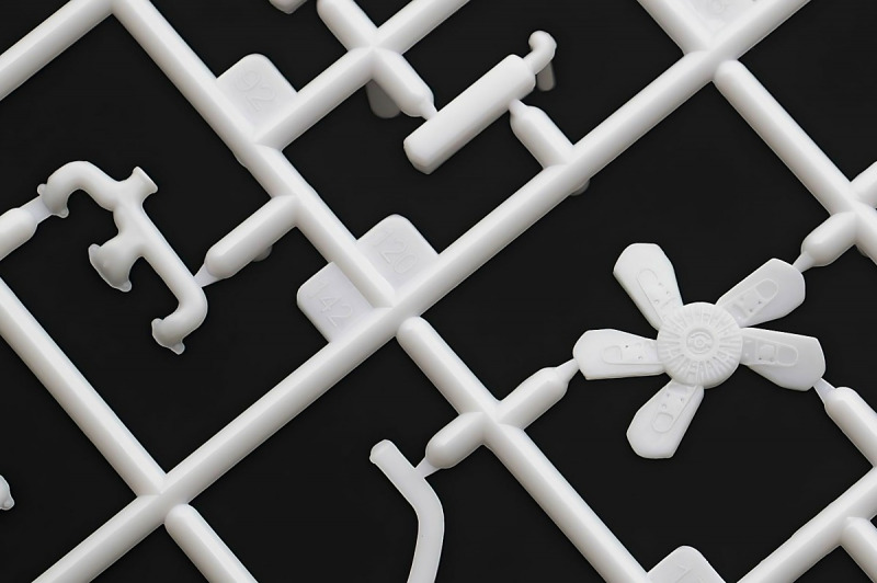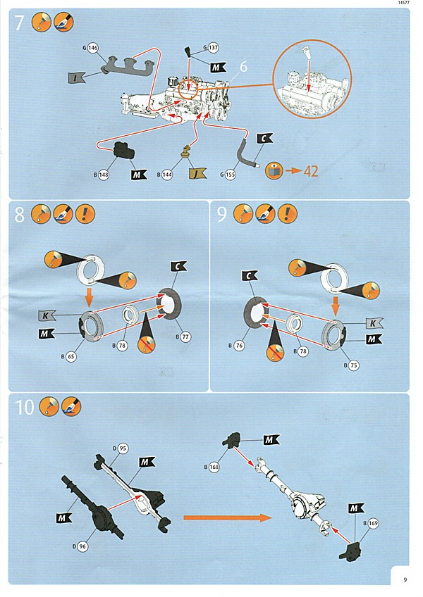 Der Aufbau des Fahrzeugs ist, was den Aufbau angeht, unspektakulär und folgt dem typischen Muster, Motor, Fahrgestell/rahmen, Innenraum, Karosserie. Letztere ist einteilig mit separater Motorhaube. Der Motor, ein aus 26 Einzelteilen bestehenden 5,7 Liter-V8 lässt keine Wünsche offen. Die fehlenden Zündkabel sind schnell selbst hergestellt, ein paar nützliche Decals werten das Aggregat weiter auf. Der Motorraum ist ebenfalls sehr schön detailliert, hier kommen nochmal 16 Bauteile zum Einsatz. Die diversen Behälter und Nebenaggregate sind eigenständige Bauteile. Die Motorhaube wird später nur aufgelegt und kann bei Bedarf abgenommen werden.