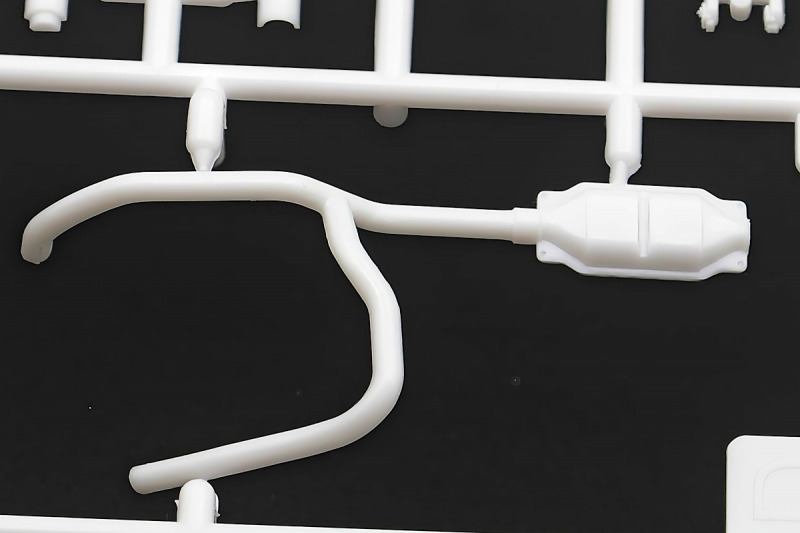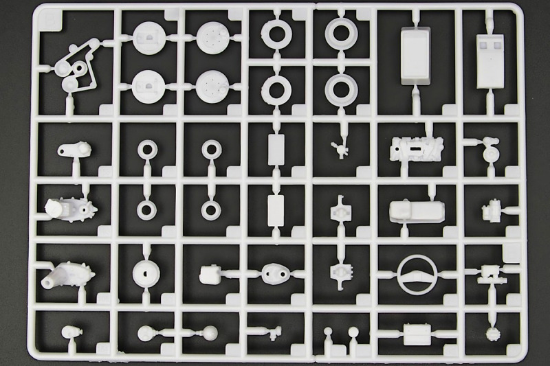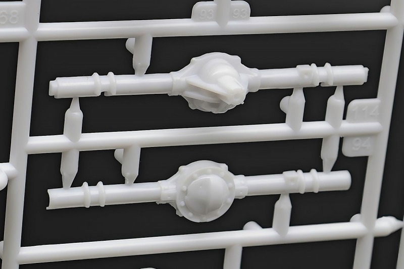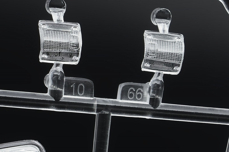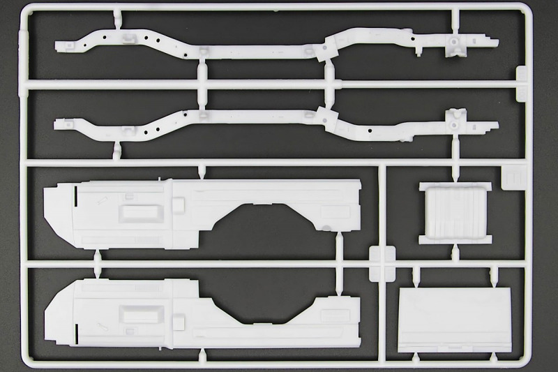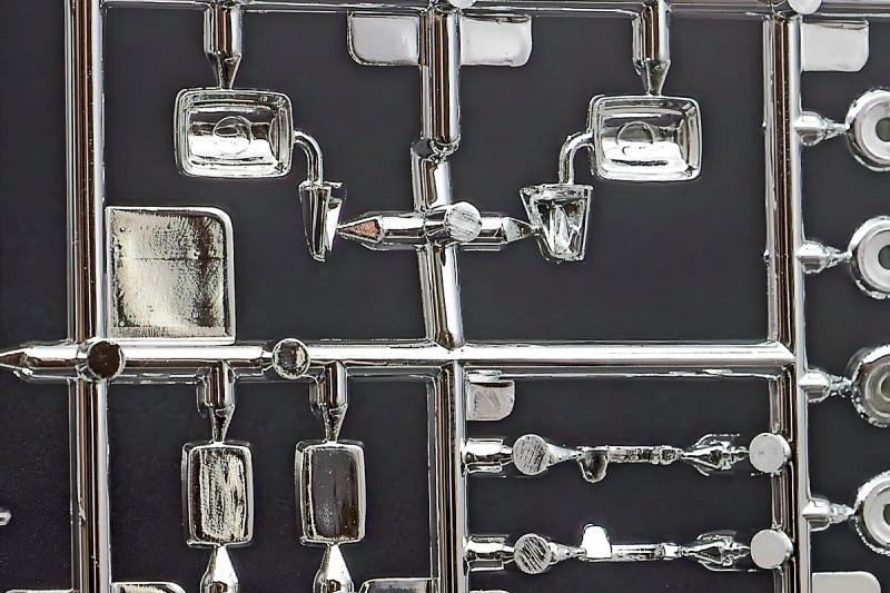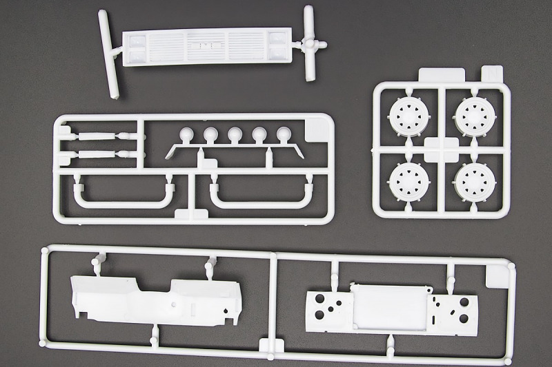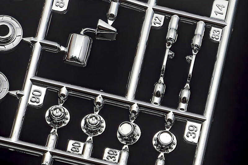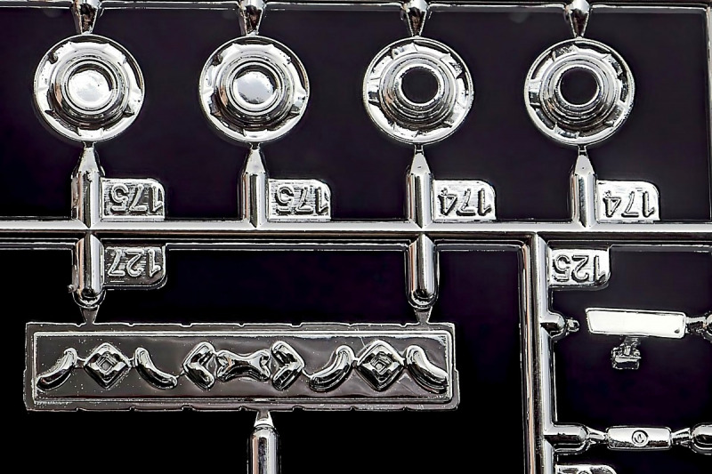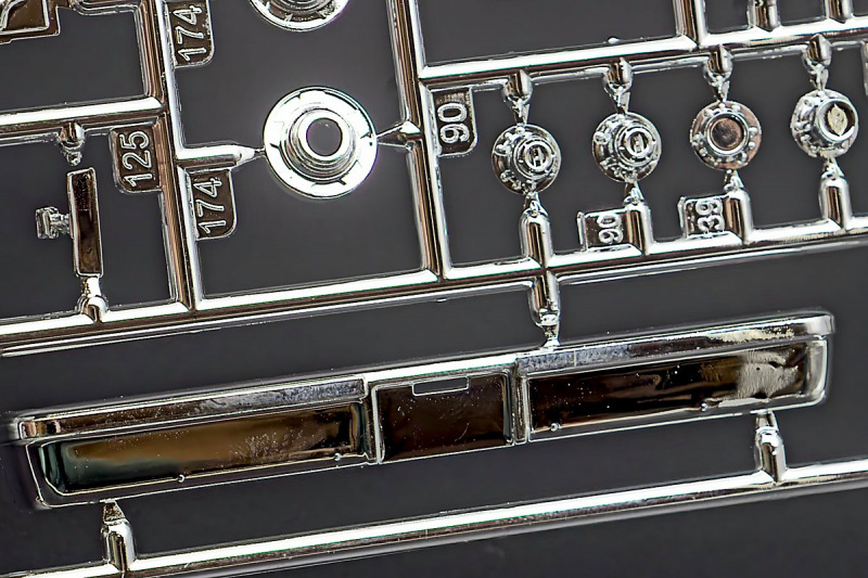 Bei den Chromteilen hat man sich auf das Wesentliche beschränkt: Spiegel, Türgriffe Stoßstangen und ein paar Teile für die Räder. Ich bin zwar kein Freund von solchen Teilen, hier jedoch gibt es nix zu meckern. Keine störenden Grate oder Fischhaut (wie sonst üblich) und auch die Angüsse sind erstens klein und zweitens halbwegs günstig platziert. Die Klarsichtteile machen einen sehr guten Eindruck, schön dünn, glasklar und schlierenfrei. Wie üblich gibt es keine Fenster für die Türen, alle anderen sind jedoch vorhanden. Sämtliche Leuchtengläser, auch die der Scheinwerferbatterie auf dem Dach sind ebenfalls als Klarsichtteile ausgeführt. Nett, die Polizeileuchte aus dem Stranger Things-Modell ist noch da :). Bleiben noch die Gummireifen, hier haben wir jetzt gegenüber vorher richtig fette, grobstollige Geländereifen. Die Felgen sind ebenfalls neu und ganz klassisch 80´er Jahre Design.