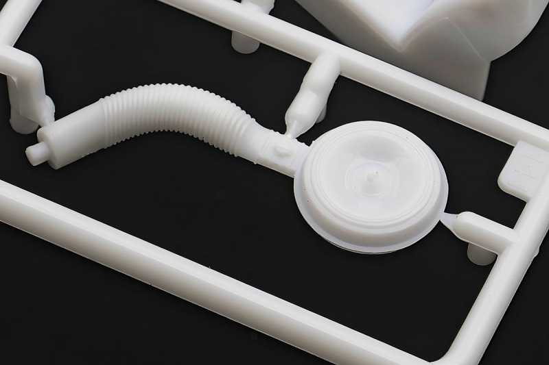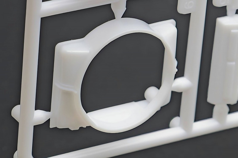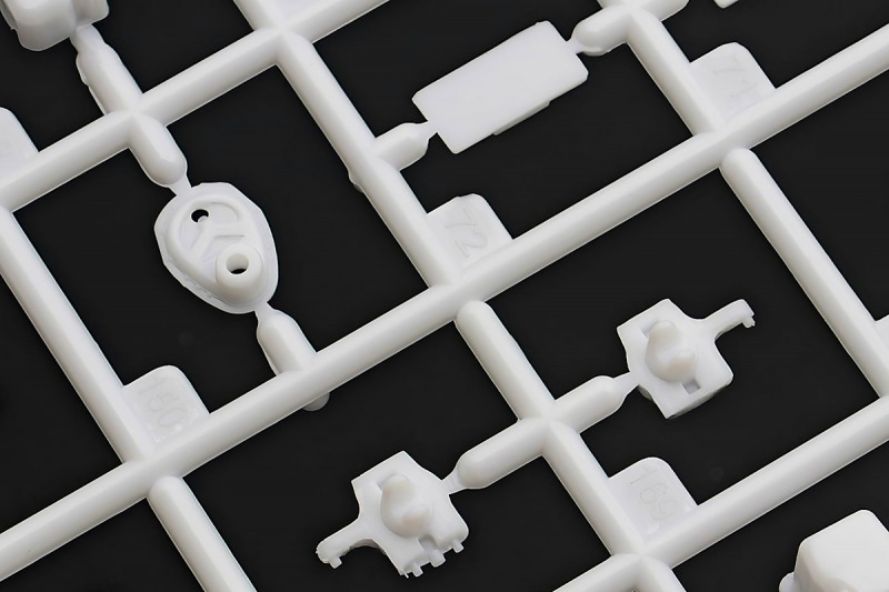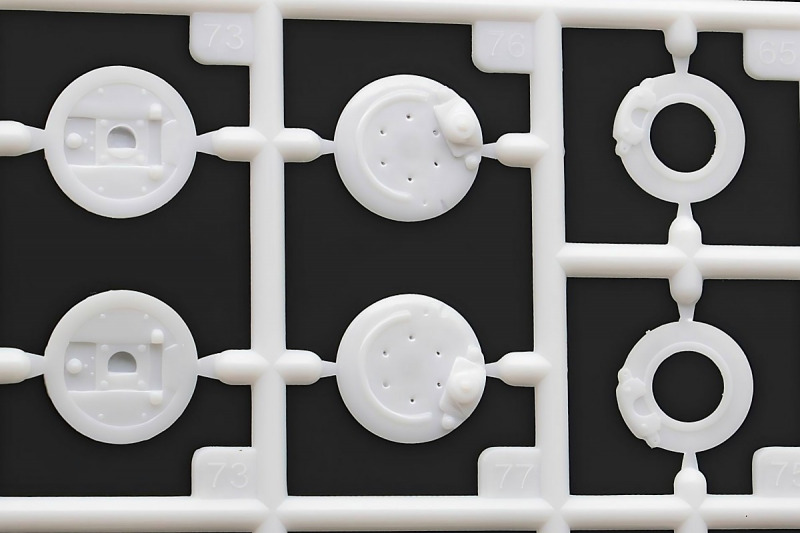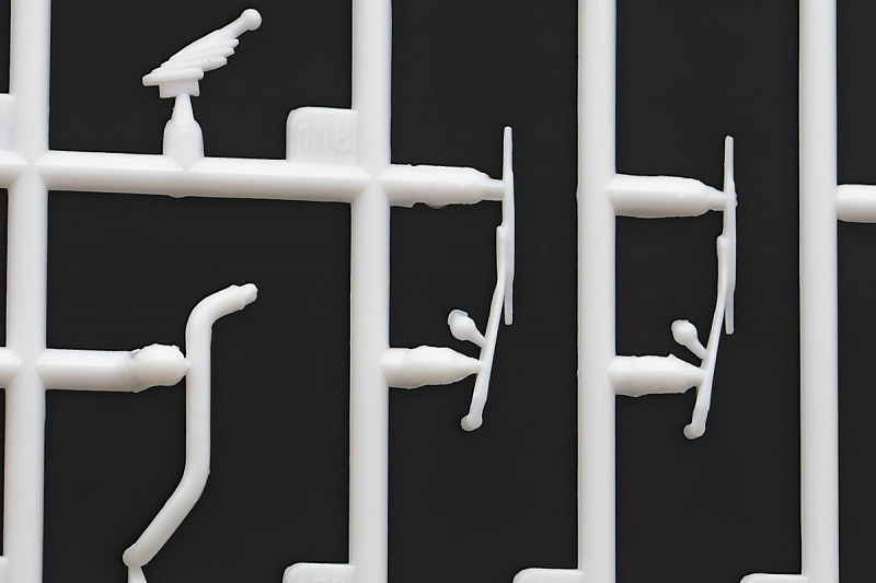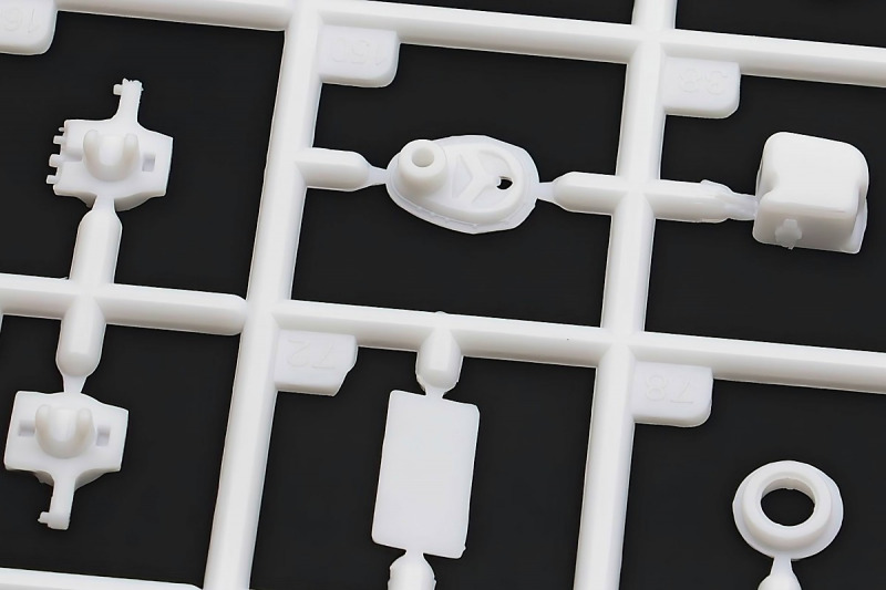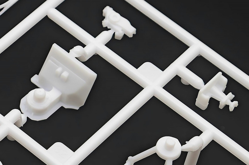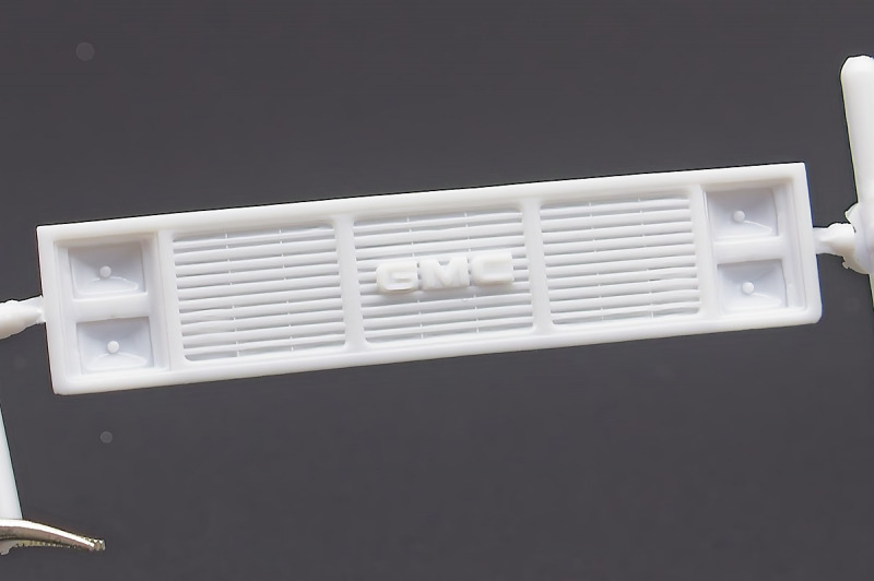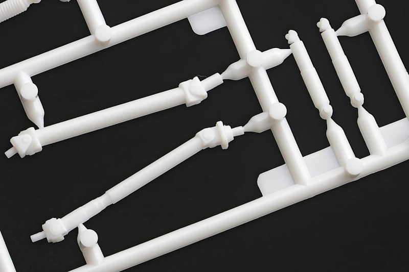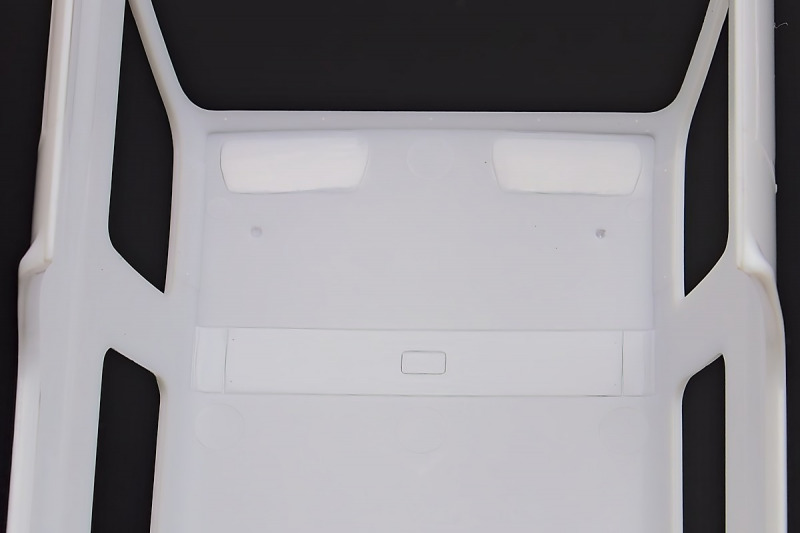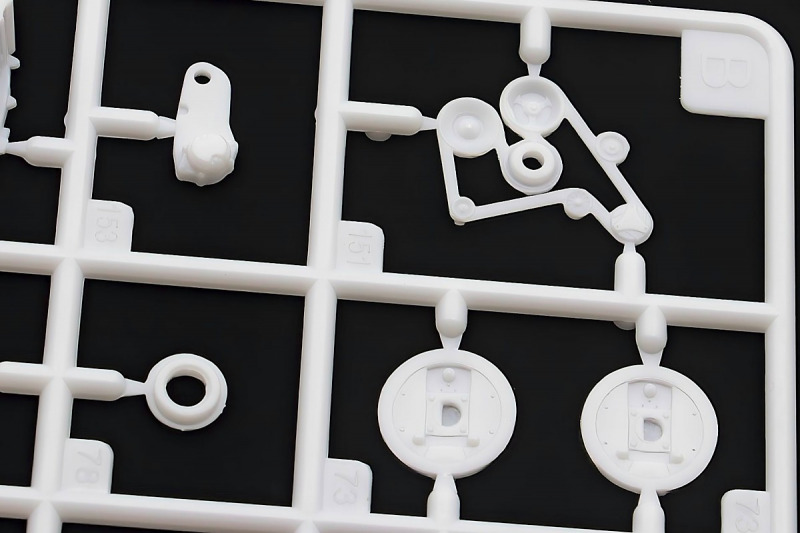 Bei den Chromteilen hat man sich auf das Wesentliche beschränkt: Spiegel, Türgriffe Stoßstangen und ein paar Teile für die Räder. Ich bin zwar kein Freund von solchen Teilen, hier jedoch gibt es nix zu meckern. Keine störenden Grate oder Fischhaut (wie sonst üblich) und auch die Angüsse sind erstens klein und zweitens halbwegs günstig platziert. Die Klarsichtteile machen einen sehr guten Eindruck, schön dünn, glasklar und schlierenfrei. Wie üblich gibt es keine Fenster für die Türen, alle anderen sind jedoch vorhanden. Sämtliche Leuchtengläser, auch die der Scheinwerferbatterie auf dem Dach sind ebenfalls als Klarsichtteile ausgeführt. Nett, die Polizeileuchte aus dem Stranger Things-Modell ist noch da :). Bleiben noch die Gummireifen, hier haben wir jetzt gegenüber vorher richtig fette, grobstollige Geländereifen. Die Felgen sind ebenfalls neu und ganz klassisch 80´er Jahre Design.