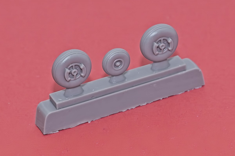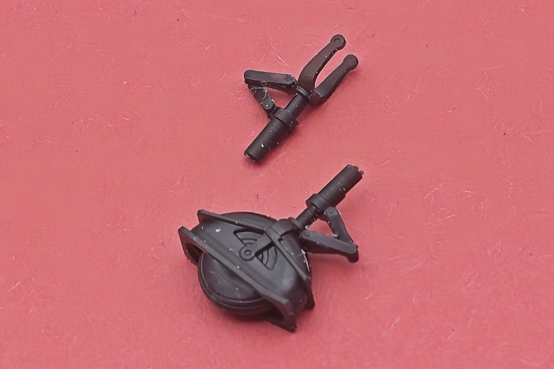 Die Fahrwerke sind aus schwarzem Resin gedruckt, welches anscheinend etwas härter bzw. stabiler ist als das graue für die Cockpitteile (dieses ist sogar eher zu weich). Die Detaillierung der Teile ist sehr gut, sämtliche Öffnungen an den Streben sind sauber durchbrochen gegossen. Beim Bugfahrwerk hat man die Wahl zwischen mit und ohne Schutzblech um die Räder. Dieses wurde bei einigen Maschinen nachgerüstet. Die Bauanleitung geht darauf nicht ein, aber für die zweite Markierungsoption (144234) gibt es Fotos, die das Blech zeigen. Die Fahrwerksschächte sind komplett leer, allerdings ist der größte Teil davon am Boden geschlossen. Vorne gibt es sogar nur ein kleines Loch, die Fahrwerksaufnahme ist Teil des Cockpitbodens. Die Lufteinläufe sind - wie auch die Schubdüse - separate Teile mit schön dünnen Einlauflippen. Der Lufteinlauf des Wärmetauschers und weitere Kleinteile (Anlenkpunkte der Landklappen, Antenne, Hecksporn) müssen noch am Rumpf angeklebt werden. Fehlt nur noch die Bugsektion, hier sind beim Original zwei Scheinwerfer hinter einer klaren Verkleidung untergebracht. Das Bausatzteil ist sinnvollerweise ais klarem Resin gegossen. Es gibt auch eine graue Version, die aber anscheinend nur dazugelegt wurde. Was da noch fehlt, ist das Pitotrohr, wie es auf dem Deckelbild zu sehen ist.