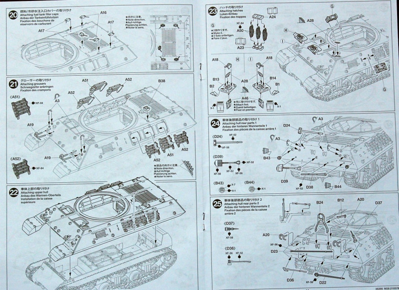 Besprechung:Zum VorbildZum historischen Vorbild kann man an dieser Stelle auf den Text anlässlich der Modellvorstellung des M36 von Academy (2017) verweisen. Über seine Einsätze im Zweiten Weltkrieg und in Korea hinaus fand der Panzerjäger M36 noch lange Jahre Verwendung, z.B. auf dem indischen Subkontinent und im früheren Jugoslawien. Aber auch das französische Indochina-Kontingent wurde mit dem Jagdpanzer in der späten Phase des Konfliktes (1951) ausgerüstet, wobei es sich um Fahrzeuge mit der 90 mm Kanone und Mündungsfeuerbremse handelte, über die die letzten 600 Exemplare der Produktion verfügten. Zwar hatte der von der Sowjetunion und der VR China unterstützte Viet-Minh (Vorläufer des Viet-Cong) keine eigenen Panzerfahrzeuge ins Feld geführt, jedoch befürchtete man in Frankreich, dass chinesische Panzer vom Typ IS 2 im Norden Vietnams eingesetzt werden könnten. Der zur Abschreckung eingesetzte Panzerjäger M36 steht für eine Phase des Krieges, in der nahezu ausschließlich amerikanisches Material auf französischer Seite eingesetzt wurde. Als Modell wurde der M36 erstmals 1975 von Tamiya aufgelegt, als M36B2 bereits sieben Jahre zuvor. In den folgenden Jahren und Jahrzehnten folgten immer wieder Modelle des M36 (z.B. Academy), wobei es sich aber auch teilweise um M36B1 (Italeri 1989, 2000, 2017) handelte, eigentlich um einen Sherman mit neuem Turm und 90 mm-Kanone. Modelle des M36 sind teilweise noch heute erhältlich (AFV-Club, Airfix). Die jüngste Umsetzung aus der M36-Familie stammt von Tamiya und ist gegenüber früheren Auflagen eine Neukonstruktion. Der BauplanAuf 20 Seiten im Hochformat (173 x 260 mm) wird der Bau des Modells in 48 Schritten anschaulich dargestellt, so dass beim Zusammenbau keine Probleme zu erwarten sind, da die Übersichtlichkeit durch eine durchdachte Zuordnung der Teile gewährleistet wird. Für den Zusammenbau der Segmentketten wird eine zusätzliche Seitenansicht abgedruckt. Außerdem müsste sprichwörtliche Tamiya-Qualität für ein gutes Gelingen garantieren – Näheres siehe Bauteile. Vermissen könnte man allerhöchstens eine Teileübersicht mit den jeweiligen Spritzlingsrahmen. Das ist inzwischen bei vielen Herstellern so etwas wie Standard; aber es geht auch ohne – alles ist eindeutig zuzuordnen. Dem Bauplan beigegeben ist noch ein Blatt mit allgemeinen Verarbeitungshinweisen und Tipps, das sich v.a. an Hobbyeinsteiger richtet. Daneben findet sich ein sechsseitiges Faltblatt mit Texten zur Geschichte des M36 (japanisch, englisch, deutsch, französisch) - vorbildlich. Nicht zuletzt finden wir auch dort zwei Farbseiten, welche die beiden im Bauplan vorgesehenen Varianten, jeweils in fünf(!) Ansichten zeigen. Optimum! Auch eine Schrägansicht des Fahrzeugs in einer Schwarz-Weiß-Grafik mit der Beschriftung wichtiger Fahrzeugteile finde ich sehr hilfreich. Nicht jeder weiß, wie das Dings vorne links heißt.