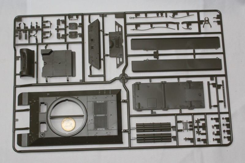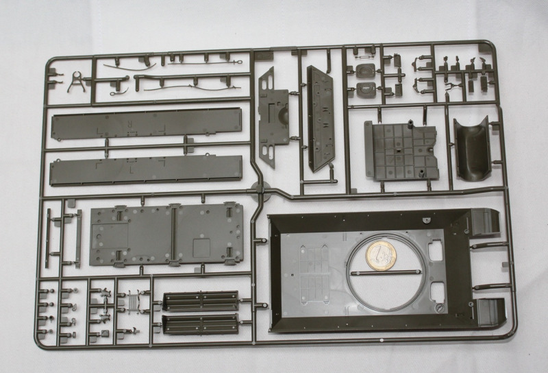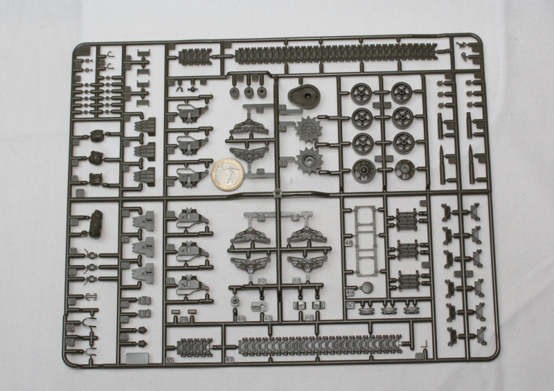 Die BauteileDie Einzelteile des Bausatzes machen einen sehr guten Eindruck: sauber gespritzt, teilweise sehr filigran. Höchstens die Flächen mögen etwas glatt erscheinen, aber auch das Original wies keine allzu raue Oberfläche auf. Das Deckelbild ist jedenfalls gut geeignet, um als Vorlage für eine farblich strukturierte Oberfläche zu dienen. Linienhaftes wie Schweißnähte sind dafür schön hervorgehoben. Insgesamt zeigt Tamiya mit dem Bausatz, was im aktuellen Herstellungsjahr mit dem klassischen Spritzgussverfahren möglich ist. Und das ist einiges... Das Thema: Panzerketten – persönliche Vorlieben und Aversionen bestimmen (allzu) oft die Diskussion. Bei Academy und Italeri setzte man früher auf die vinylartigen Gummibandagen, die vielen zu wenig Kettendurchhang ermöglichten. Auch Einzelgliederketten sind nicht nach jedermanns Geschmack. Tamiya löst das Problem mit Segmentketten, die aber auch nicht alle Modellbauer überzeugen, da im Bereich der Antriebsräder und Umlenkrollen Einzelglieder zusammengeklebt werden müssen und in Kombination mit den längeren Segmenten ordentlich Potenzial für Ungenauigkeiten bieten. Tamiya löst das Problem eigentlich sehr pfiffig: die längeren Kettensegmente haben auf der Innenseite jeweils eine Vertiefung, in die kleine Kunststoffnippel auf einer Stützrolle nach dem Prinzip Mönch und Nonne exakt hineinpassen. Entsprechende Laufrolle lässt sich durch eine Art Schlüsselloch eindeutig positionieren. Damit müsste sich die Kette problemlos zusammenbauen und „aufziehen“ lassen, wenn man die Reihenfolge beachtet, die durch Ziffern vorgegeben wird. Und es sei extra nochmal darauf hingewiesen: Nur das Abtrennen, was die Bauanleitung ausdrücklich frei gibt. Positiv vermerken darf man die wenigen Angusspunkte, was das Versäubern erheblich vereinfacht. Wer „out of the box“ bauen möchte, dem beschert Tamiya einen echten Convenience-Kit.