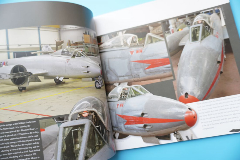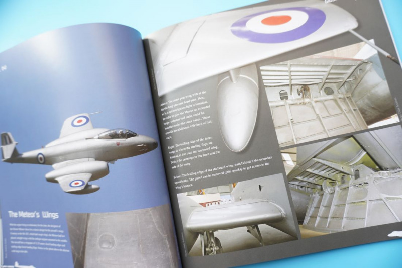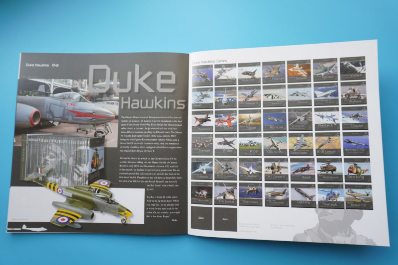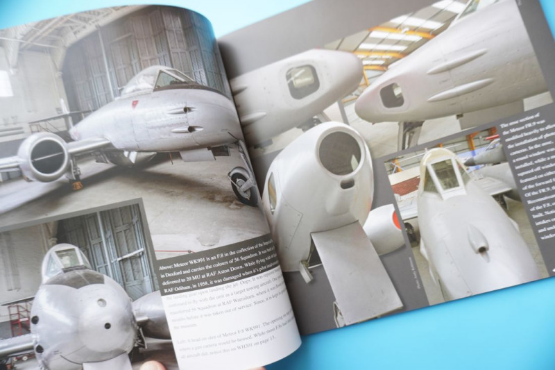 Gloster Meteor F.8 - Literatur von Duke HawkinsDie über dreißig Bücher von Duke Hawkins sind seit der Ausgabe der ersten Bände für Modellbauer in zweierlei Hinsicht sehr interessant. Zum einen werden meist originale, aktuelle Aufnahmen der Flugzeugvorbilder gezeigt, entweder live "on base" oder aus Museen oder Sammlungen, zum anderen sind die kurzen Begleittexte sehr informativ und beleuchten meist die technischen oder geschichtlichen Hintergründe des jeweiligen Flugzeugs, ohne zu zahlenlastig oder statistisch zu werden. Es sind kurzweilige, schön bebilderte und unterhaltsame Werke, die beim Lesen Freude machen. So ist es auch im vorliegenden Buch, was nach Angaben des Autors Hawkins extra aufgrund der von Revell angekündigten Herausgabe des vorliegenden Bausatzes erfolgt sei. So steuert das Buch interessante Information zu genau der von Revell dargestellten F.8 und FR.9 (und in Teilen auch anderen) -Varianten der Meteor bei. Auf der letzten Seite sieht man gar ein gebautes Modell des vorliegenden Bausatzes. Alles in allem eine wirklich sinnvolle, passgenaue Bausatzbeigabe. Aufgeschlagen - einige Buchseiten auszugsweise