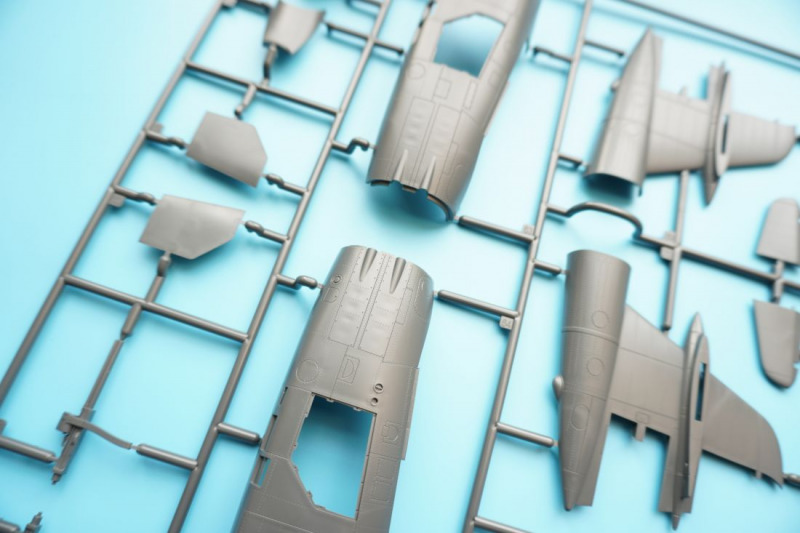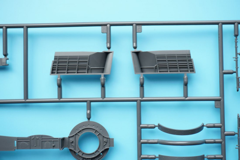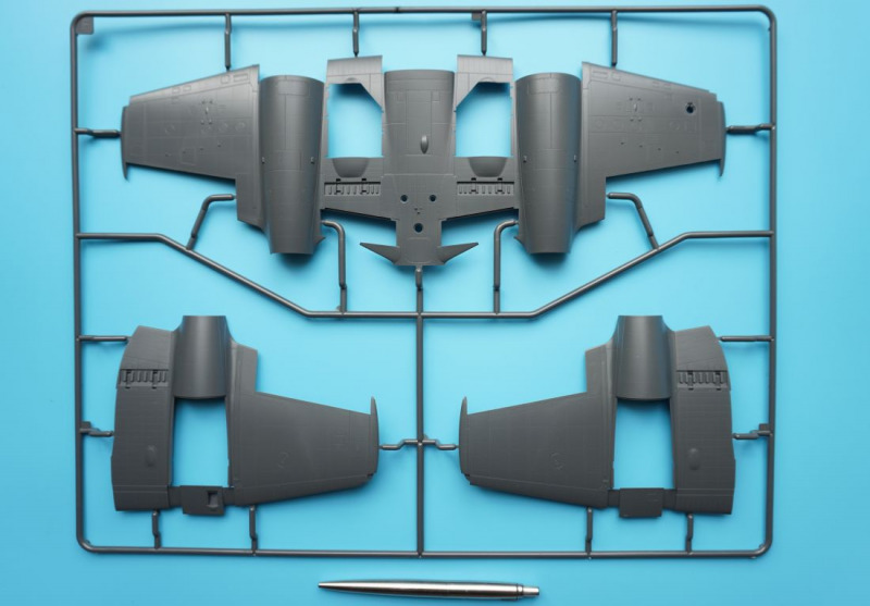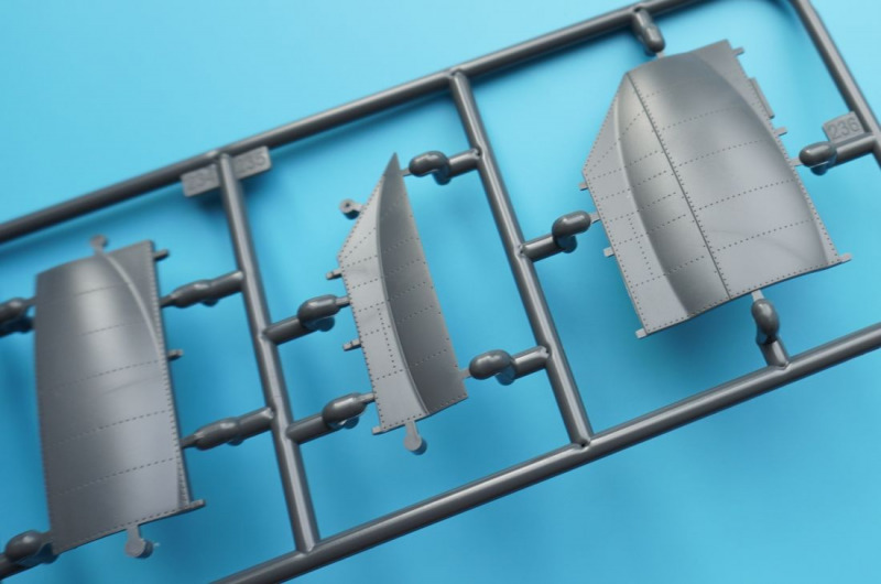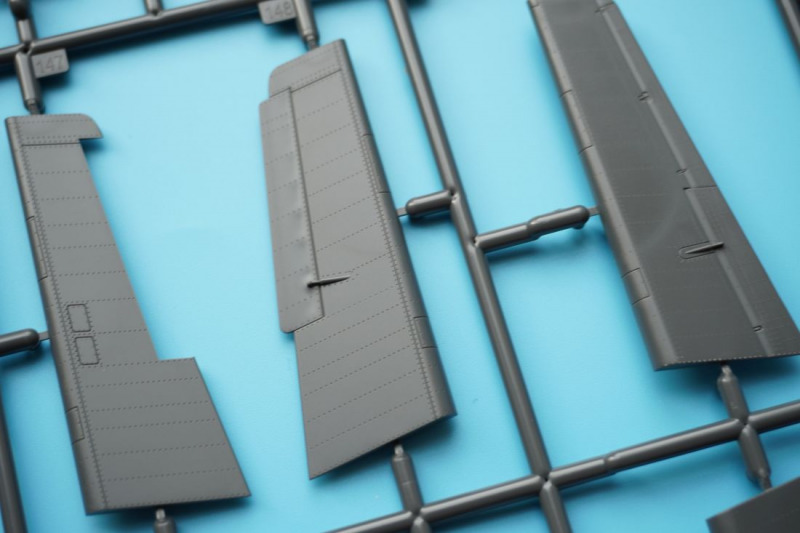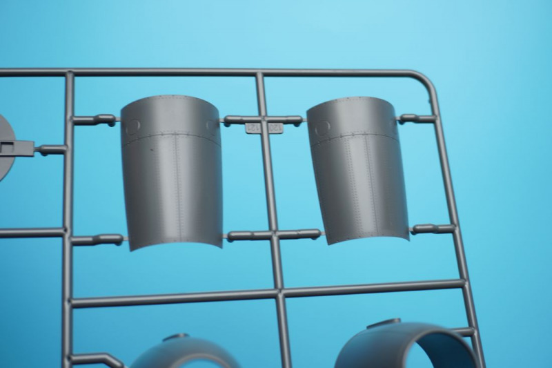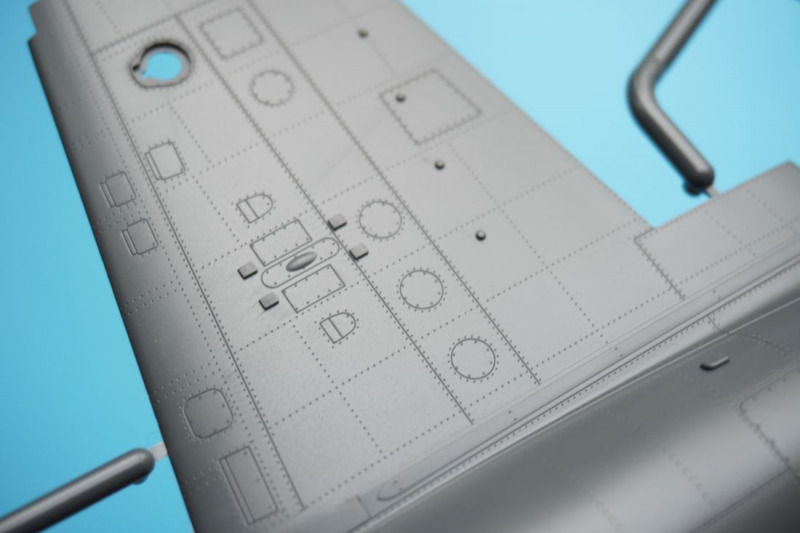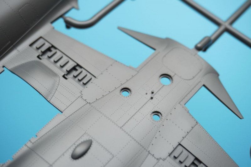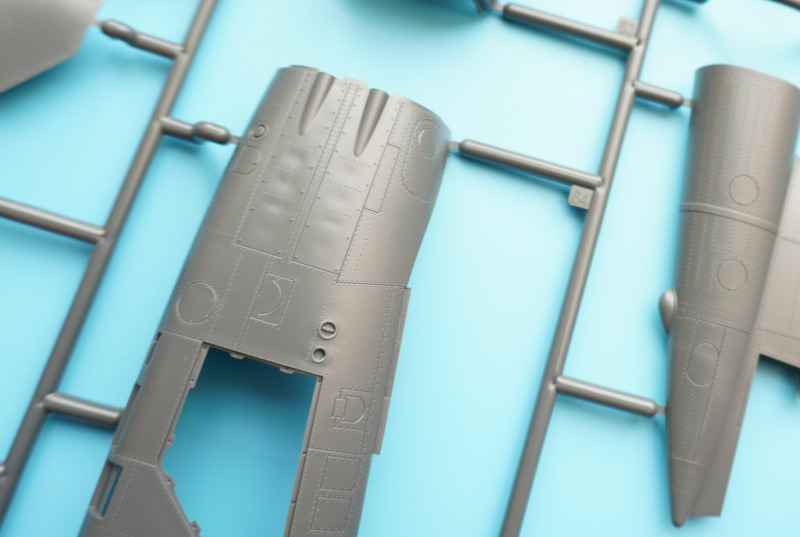 Und was ist das?Beim näheren Betrachten der Kunststoffteile fallen sofort zahlreiche knackige Panellines und messerscharfe Gravuren auf den Bausatzoberflächen ins Auge. Zudem ist das ganze Modell von unendlichen, realistisch wirkenden Nietreihen überzogen, bei denen sich Rundkopfniete und Senkniete je nach Modellbereich abwechseln. Da schlägt das Modellbauerherz höher! Es sind diese "scharfen" Gravuren bei Revells Flugzeugmodellen im Maßstab 1:32, die ich seit der Herausgabe der Hawker Hunter vor mehr als zwanzig (!) Jahren vermisst habe, und die leider auch bei Revells WW2-Repliken in 1:32 von Bf 109, Fw 190 und He 219 nicht vorhanden waren. Dort sind es eher verwaschen wirkende Modelloberflächen mit nur spärlicher Nietdarstellung. Und nun sind sie wieder da, diese klaren Gravuren, und daneben sogar noch einige weitere erfreuliche Features: auf den Panels der Kanonencowlings ist die manchmal beim Original verzogene/eingedellte Blechhaut sehr gut erkennbar. Diese als "strained surface" bezeichnete Verformung von Metalloberflächen ist hier erfreulich realistisch dargestellt. So eine Oberflächenbeschaffenheit war sonst nur bei den Großmodellen von Airfix (Typhoon, 1:24) oder Border Models (Lancaster, 1:32) zu finden und galt seinerzeit als "revolutionär" bei einem Mainstream-Polystyrolkit. Einige Details des Bausatzes
