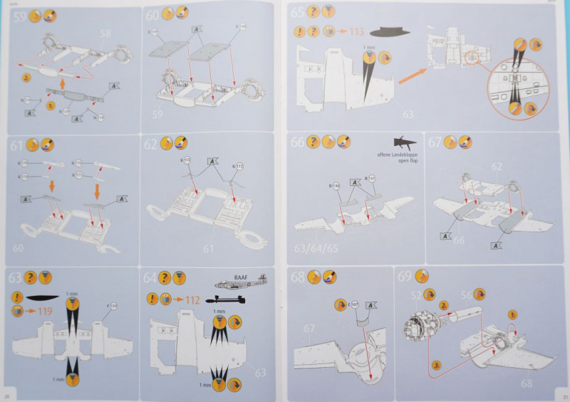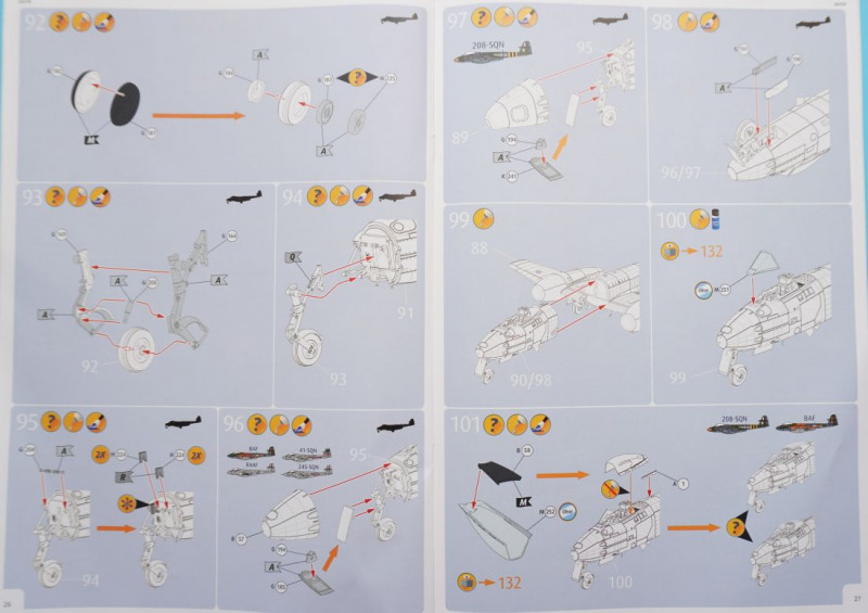 Hier die optionale Bugnase für die FR.9-Variante Besonderheiten beim BauIm Cockpit können die beiliegenden Fotoätzteile insbesondere am dortigen Schleudersitz für die Sitzgurte verwendet werden, oder man benutzt Bauteil A14, an dem die Sitzgurte angegossen sind, was meiner Meinung nach aber etwas statisch wirkt. Der beigefügte Pilot (Hurra, Revell, die Beigabe einer Pilotenfigur bei einem Flugzeugbausatz ist eine super Idee!) wird mit angegossenen Sitzgurten in das Cockpit hineingesetzt. Die Pilotenfigur selbst ist mit zwei Köpfen versehen, die wahlweise Kopfhaube oder Helm tragend dargestellt sind. Das Hauptinstrumentenbrett ist wahlweise mit Decals zu bekleben - hierfür sind ein flächiges Decal und einzeln gedruckte Rundinstrumente zu verwenden. Alternativ kommen wieder die Fotoätzteile zum Einsatz, die in vertrauter Weise nach dem Glätten des Instrumententrägers A44 in Schichtbauweise aufeinandergeklebt werden und dadurch eine gewisse plastische Tiefenwirkung erzeugen. Netterweise sind die Instrumentengläser bereits - Eduard sei dank - durch werkmäßig aufgebrachten Transparentlack dargestellt. Grundsätzlich sollte sich der Bastler vertraut machen mit den vorgesehenen einzelnen Bohrungen für Löcher im Rumpf und Flügeln zur Befestigung von Klein- und Anbauteilen wie Antennen, Raketen, Zusatztanks. So erwarten uns in Baustufe 64ff. einige versionsspezifische Bauschritte, bei denen man sich für die Vorbereitung der Montage der Raketenwerfer (für die australische Version) oder für die Anbringung der Außenlasttanks entscheiden muss. In Baustufe 33 besteht die Wahlmöglichkeit, die Einstiegshilfe unterhalb des Cockpits entweder ein- oder ausgeklappt zu montieren, wofür jeweils unterschiedliche Bauteile erforderlich sind. Die Kanonenabdeckungen, zwei Panels für jeweils die linke und rechte Seite, können ohne geklebt zu werden auf die beiden Rumpfhälften gesetzt werden (Baustufe 34). In Baustufe 90 kommt es zur Wahl der jeweils passenden Flugzeugnase: hier ist der Bau der Recce-Version für die FR.9-RAF-Variante möglich, und somit für eine technisch durchaus interessante Variante, oder man montiert die "Standardnase", die für die vier weiteren Versionen gebraucht wird. Tollerweise enthält der Kit zwei komplette Rolls-Royce Derwent 8 Jet-Triebwerke, die jeweils entweder im eingebauten Zustand bei geöffneter Abdeckung gezeigt oder auf dem jeweiligen Transportgestell angebracht und somit losgelöst vom Flugzeug präsentiert werden können. Eine klasse Sache! Außerdem ist beachtlich, dass man für die Variante der RAAF-Maschine andere vordere Triebwerkabdeckungen und Einlauftunnel verwenden soll, als bei den vier weiteren Varianten (Baustufen 75/76). Außerdem sind je nach Maschine zwei unterschiedliche Querruder an den Maschinen zu montieren, was in Baustufe 116 erläutert wird. Da scheint ordentlich recherchiert worden zu sein. Und Teile für die Grabbelkiste bleiben auch noch übrig. Erwähnenswert ist zudem die Montage des stabförmigen Luftbetankungsstutzens bei der F.8-Version der "WA-82" der 245 Squadron, während alle anderen Varianten mit "Standardnase" ohne diese markante Nasenspitze auskommen. Und endlich - die Fahrwerksreifen werden realistischer Weise im belasteten Zustand ("abgeplattet") dargestellt, so dass man sie ohne große Nacharbeit verbauen kann. Nach ersten vorliegenden Erfahrungsberichten im Internet sind die Passgenauigkeit und Montagelogik des Bausatzes sehr erfreulich. Hier wird auf die gut durchdachte, und insbesondere an den Verbindungsstellen Rumpf-Flügel oder Vorder-Hinterrumpf deutlich werdende Stabilität der Verbindungselemente hingewiesen. Auch die Fahrwerkskonstruktion wird als sehr gut durchdacht und stabil beschrieben. Es wird auch vermerkt, dass der "Einbau" des Piloten im Cockpit das Weglassen der Ruderpedale erfordere und dass reichlich Ballast hinter dem Cockpit platziert werden solle, um keinen "Tailsitter" zu produzieren. Dies kann übrigens in den "leeren" Munitionsboxen erfolgen, die sich hinter dem Schleudersitz befinden und nach dem Befüllen mit Bleigewichten oder ähnlichen Beschwerungen einfach mit dem Munitionskistendeckel verschlossen werden. Insgesamt hören sich die bisherigen Bastel-Reviews des Kits allesamt sehr erfreulich an! Wenn das mal keine Vorhersehung für ein Modell des Jahres ist... Die Bauanleitung