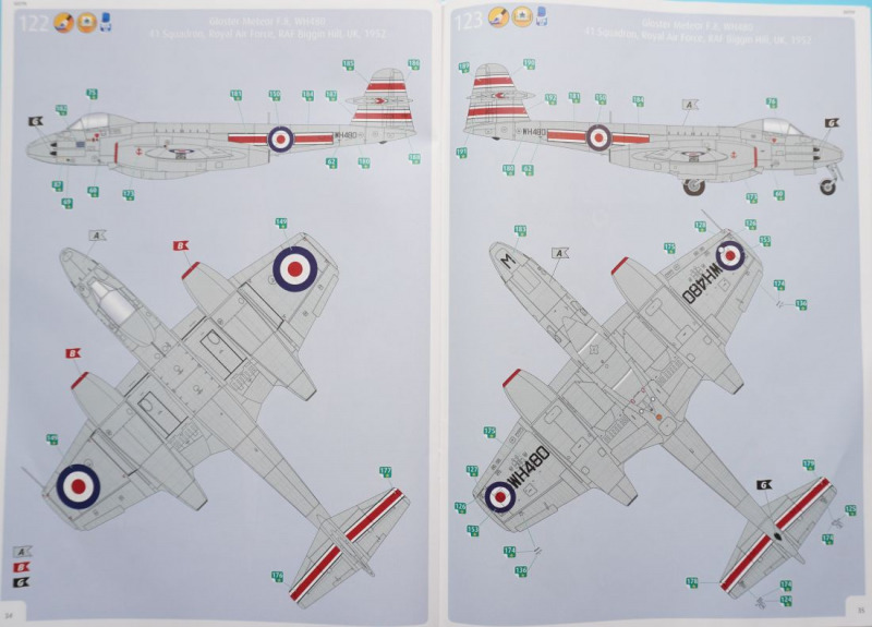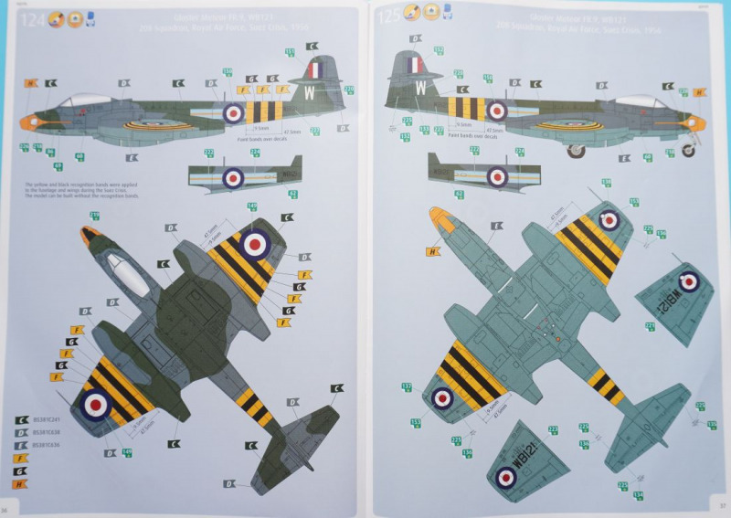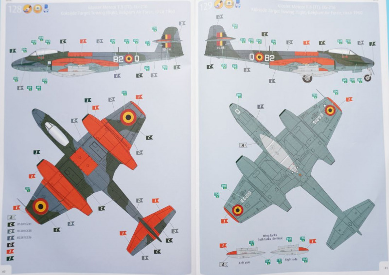 Lackierung, Versionen, Decals, MaskenBei der Auswahl einer der fünf Kit-Varianten hat der Bastler wirklich die Qual der Wahl. Nicht nur, dass es sich um teils recht farbenfrohe Vertreter dieses Jets in entweder Naturmetallausführung oder mit Sichtschutzanstrichen handelt. Es ist mit der FR.9-Variante auch die technisch interessante Aufklärervariante der Meteor dabei, die gar als "scharfe" Einsatzmaschine bei der Suez-Krise im Jahre 1956 geflogen ist. Und auch die RAAF-Maschine hat mit dem Einsatz über Korea eine kriegerische Vergangenheit vorzuweisen. Oder darf es vielleicht ein Zielschlepper der belgischen Luftwaffe sein, der in einem attraktiven Tarnschema mit orangen Signalfeldern daherkommt. Wie gesagt, die Qual der Wahl... Die Qualität der von Cartograf in Italien gedruckten Decals ist, wie nicht anders zu erwarten, von allererster Güte: kein Druckversatz, kräftige Farben, präzise Beschriftungen und dünne, glänzende Decaloberflächen, wie vom Hersteller gewohnt. Auch berichten erste Bastler online von einer hervorragenden Verarbeitung dieser Decals. Mit den enthaltenen Abklebemasken können die beiden Cockpitkanzeln jeweils von innen und außen maskiert und sprühlackiert werden.