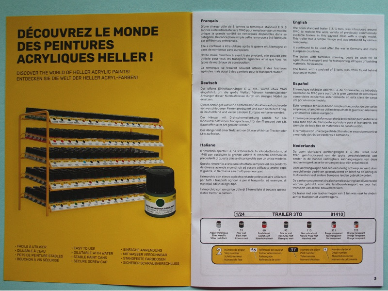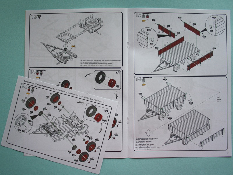 Die Reifen aus Vinyl-Vollmaterial weisen ein zeitgemäßes Profil auf, eine Beschriftung ist nicht vorhanden. Die Decals sind sauber und versatzfrei gedruckt, sie bieten eine große Auswahl an verschiedenen Kennzeichen. Auch an ein Typenschild, Tonnagebeschriftung und das obligatorische 25 km-Schild ist in dreifacher Ausführung wurde gedacht. Die Bauanleitung führt in 17 Schritten zum fertigen Modell, in den jeweiligen Schritten sind die zu verbauenden Teile farbig dargestellt. Es gibt Farbangaben, die sich auf das Sortiment von Humbrol-Heller beziehen. Für die Baustufe 14 ist ein Korrekturblatt beigelegt, hier sind in der Bauanleitung die Teilenummern für die Radnaben falsch angegeben.