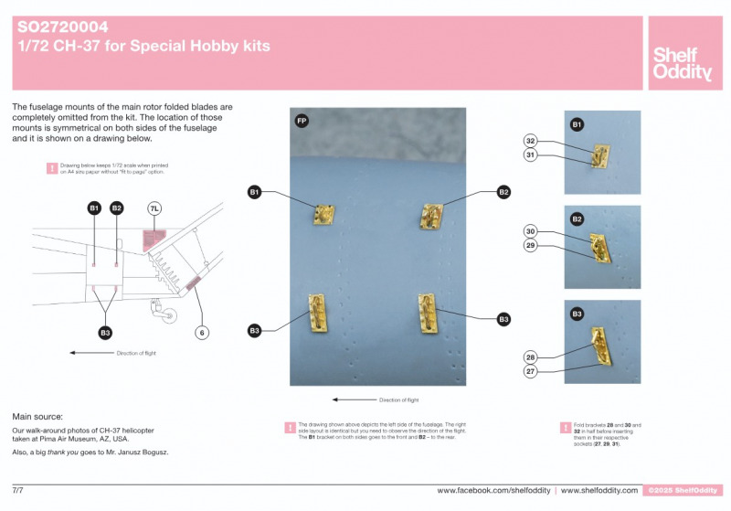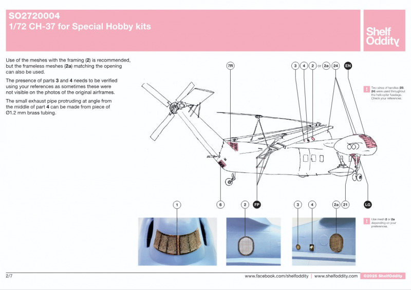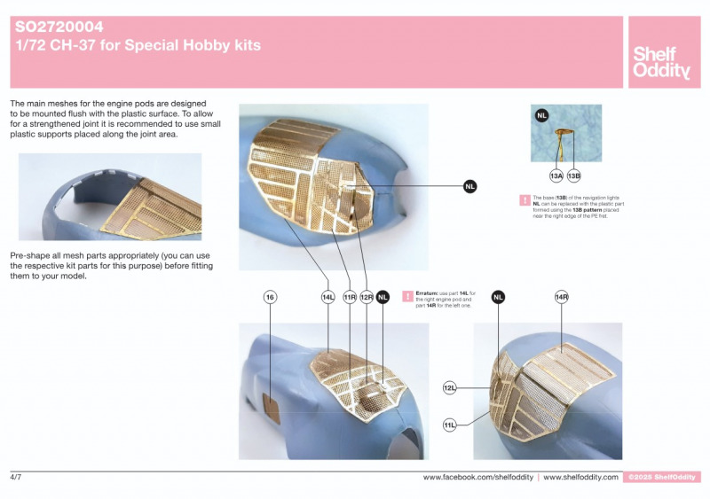 Besprechung:Fast zwei Jahrzehnte sollte es dauern, bis der geneigte Modellbauer endlich einen Detailsatz für den Großraumtransporthubschrauber CH-37 bekommen hat. Meiner Meinung nach ist dieser für den erfolgreichen Bau zwar nicht notwendig, erleichtert die realistische Darstellung des Hubschraubers jedoch ungemein. Zum Umfang des Sets gehören vor allem die vielen Gitter, welche am Hubschrauber verbaut werden, aber auch weitere Griffe, Details für das Fahrwerk, Scheibenwischer sowie diverse weitere Details am Rumpf. Die Teile sind sehr dünn und lassen sich leicht verbiegen, was zugleich Fluch und Segen sein kann. Für die meisten Gitter muss man mit dem Dremel an den Rumpf heran und entsprechende Bereiche entfernen. Dabei sollte man insbesondere im Bereich des Rotorkopfs darauf achten, dass später kein Licht, das durch die Fenster in den Rumpf fällt, sichtbar bleibt. In einigen Fällen kann es jedoch ausreichen, die darunterliegenden Flächen schwarz zu lackieren und das Ätzteil darüberzukleben. Am Heckausleger sollte man den Dremel allerdings unbedingt einsetzen, da beim Vorbild hier ebenfalls Licht einfällt. An den Motorgondeln werden die Kunststoffteile hingegen einfach durch die deutlich feineren PE-Teile ersetzt. Empfohlen wird, kleine Plastikstreifen als Klebefläche zu verwenden; zudem sollen sich die Bausatzteile gut als Biegehilfe eignen. Trotz dieser Hilfen ist das Anbringen der Teile recht aufwändig und erfordert einiges an Geduld, nicht zuletzt wegen der nur durchschnittlichen Passgenauigkeit. Das Ergebnis kann sich jedoch sehen lassen. Zu bedenken ist außerdem, dass der Einsatz der PE-Gitter an den Motorgondeln den Blick ins Innere freigibt, weshalb gegebenenfalls einfache Attrappen ergänzt werden sollten, um einen Blick ins Leere zu vermeiden.