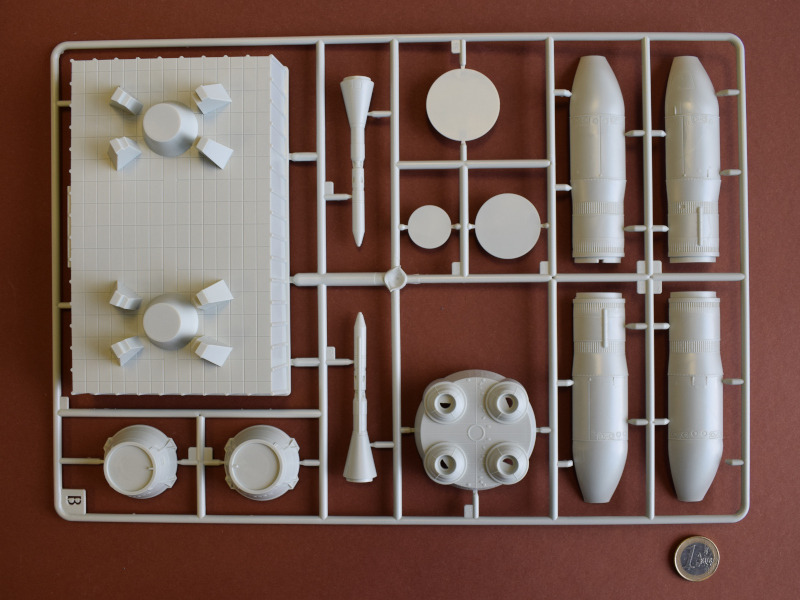 BesprechungDer BausatzZunächst fällt der Karton auf: Hier verwendet Revell das neue, in Schwarz gedruckte, Design und Format. Wie gewohnt befinden sich auf der Rückseite weitere Fotos des Modells und ergänzende Informationen. Mit 44 x 24 x 11 cm ist er quasi maßgeschneidert groß für die Spritzrahmen. Gegenüber der Testshot-Version (siehe Bericht hier) sind die Spritzrahmen unverändert. Lediglich die Farbe des verwendeten Kunststoffgranulats ist etwas heller. Die vier Rahmen sind in drei Beuteln verpackt. Die in dem Testshot-Bericht erwähnten „rauhen Stellen" sind nicht mehr vorhanden. Unsauberkeiten sind jetzt an keiner Stelle mehr zu finden, die Angüsse an die Bauteile sind angenehm klein. Die versenkten und erhabenen Gravuren sind für den Maßstab 1:144 subjektiv etwas groß, aber das stört nicht weiter. Dafür sind die Gravuren scharfkantig und deutlich ausgeprägt.