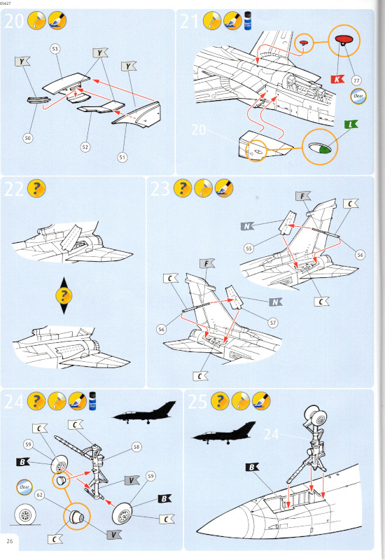 Die BauanleitungDie Bauanleitung ist im Format A4 gedruckt und besteht aus 44 farbigen Seiten. Die Zeichnungen haben eine ausreichende Größe und sind leicht verständlich. Bauoptionen zu verschiedenen Außenlasten, andere Bauoptionen oder Gewichtsangaben sind vorhanden. Sie gibt an, dass 22 Farben benötigt, bzw. selbst angemischt werden sollen. Die im Beutel enthalten Farben decken den tatsächlichen Bedarf nicht einmal ansatzweise. Könnte man hier sagen: Der gute Wille zählt?