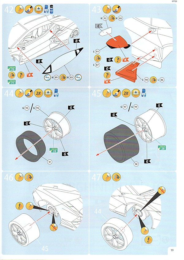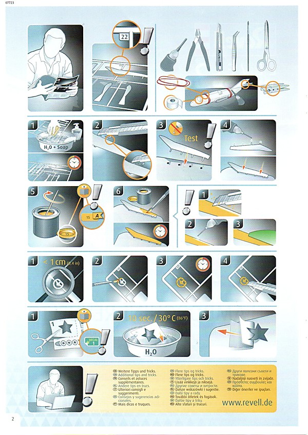 Der sehr sauber in Italien gedruckte Decalbogen ist für ein Zivilfahrzeug recht üppig ausgefallen. Das liegt zum Einen an den zahlreichen Carbon Look-Decals, zum Anderen an den (leider oftmals fehlerhaften) Kennzeichen. So ist das GB-Kennzeichen noch aus der EU-Zeit, besser wäre hier UK mit einem kleinen Union Jack gewesen, zumal die "25" auf das Zulassungsjahr 2025 hindeutet. Der Bogen enthält auch alle benötigten Schriftzüge und Logos. Außerdem erleichtert Revell uns die Bemalung des Innenraums, da auch die farblich auf die Außenfarbe abgestimmten Elemente für die Türverkleidungen enthalten sind. Diese setzt natürlich voraus, dass man sich für das Orange entscheidet. Die Carbondeclas sind ein bisschen tricky, hier muss man stellenweise aufpassen, dass man die richtigen Decals verwendet. Zum Beispiel an den Innenteilen der seitlichen Lufteinläufe, hier muss man pro Seite nicht weniger als acht Decals aufbringen, alle mit unterschiedlichen Formen. Die 20-seitige Bauanleitung ist wegen der vielen Hinweise ein wenig unübersichtlich. Zwar werden immer nur wenige Bauteile verwendet, man muss aber trotzdem sehr genau hinschauen, dass alle Farben und Decals an den richtigen Platz kommen. Vor allem die vielen Grau- und Schwarztöne sind etwas verwirrend. nebenbei bemerkt sollte man bei Revell mal über eine Erweiterung der Farbpalette nachdenken. Dieses Schwarz-Dunkelgrau-Gemisch z.B. ist mittlerweile fast bei jedem Bausatz erforderlich. Auf der letzten Seite wird auch die Funktion des Plastikwinkels ersichtlich, er ist für ein kleines Namensschild. Scheint auch neuerdings immer mit dabei zu sein, sehr nützlich - Danke, Revell. Darstellbare Fahrzeuge: