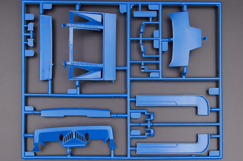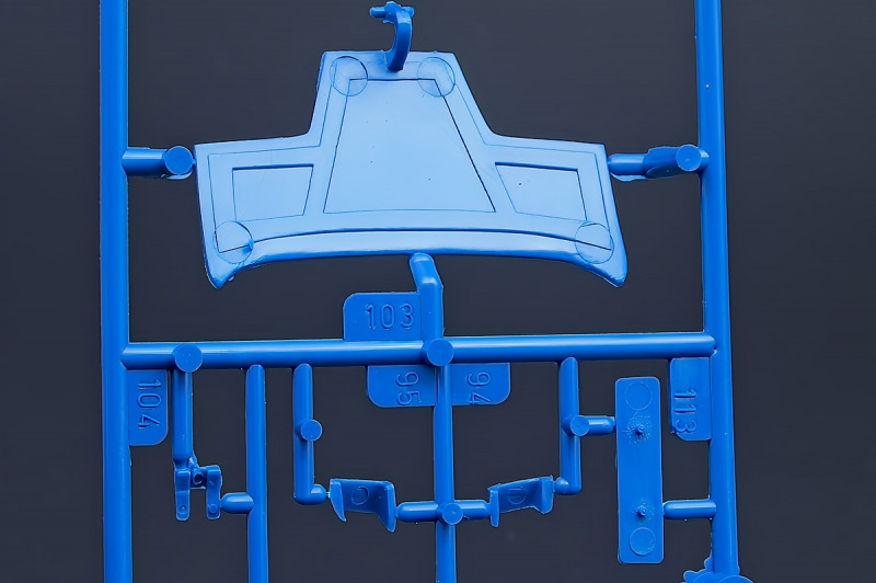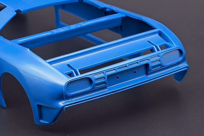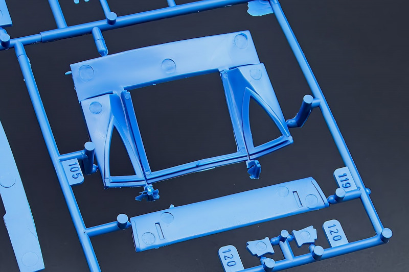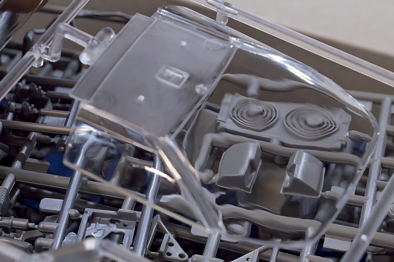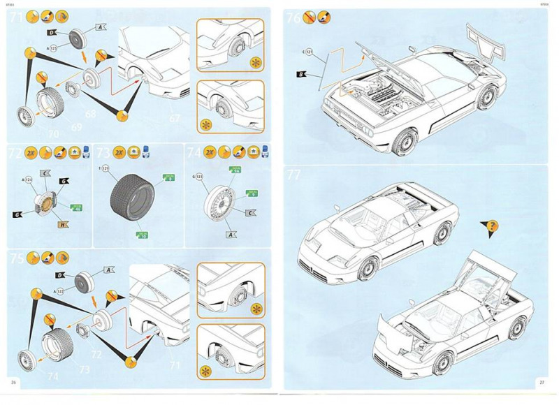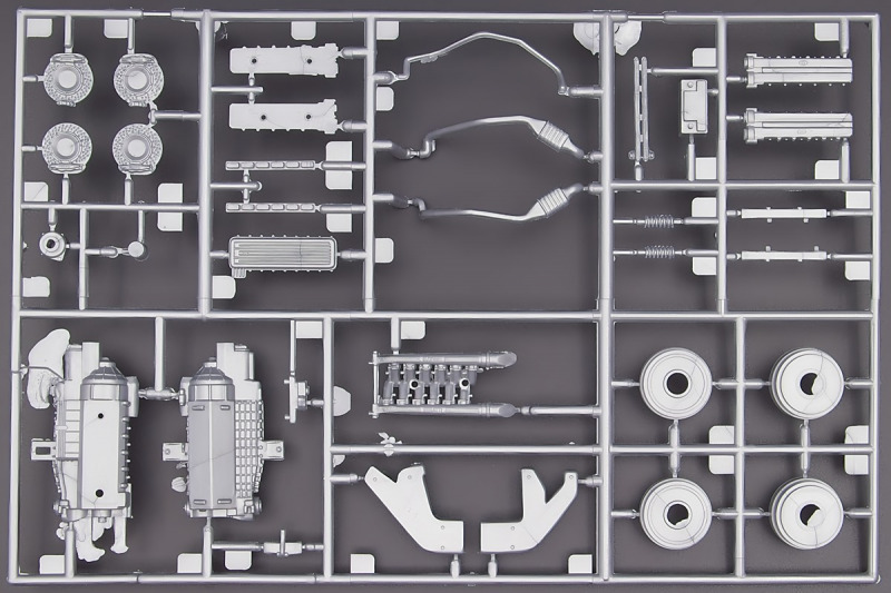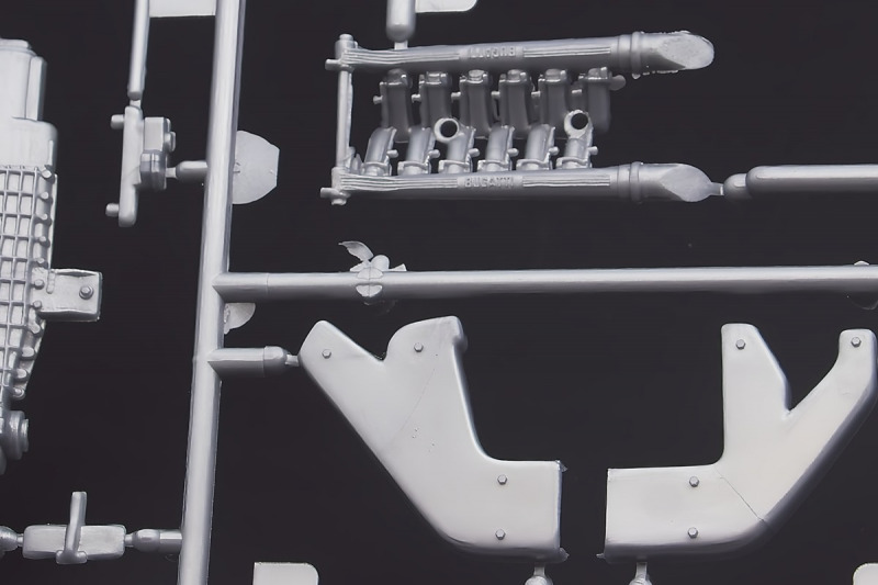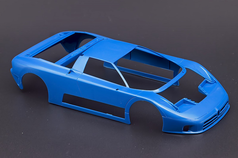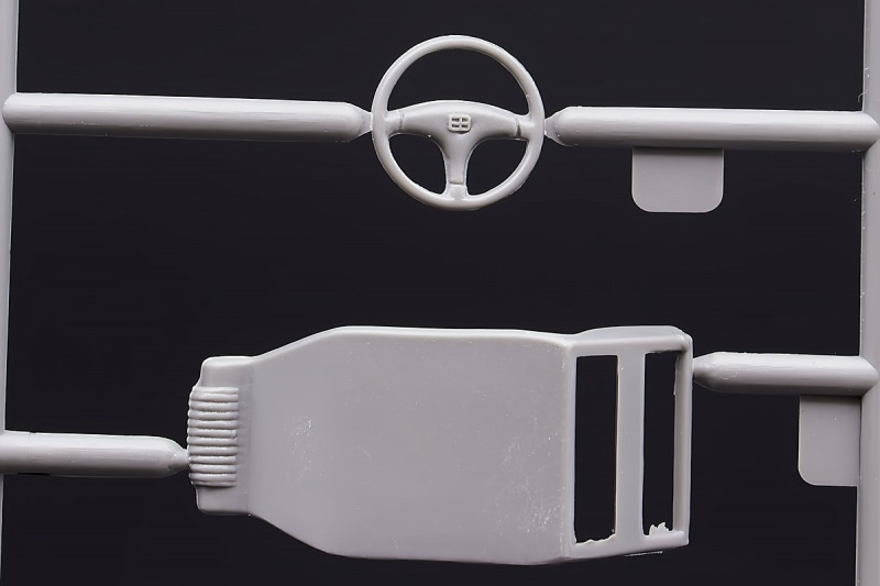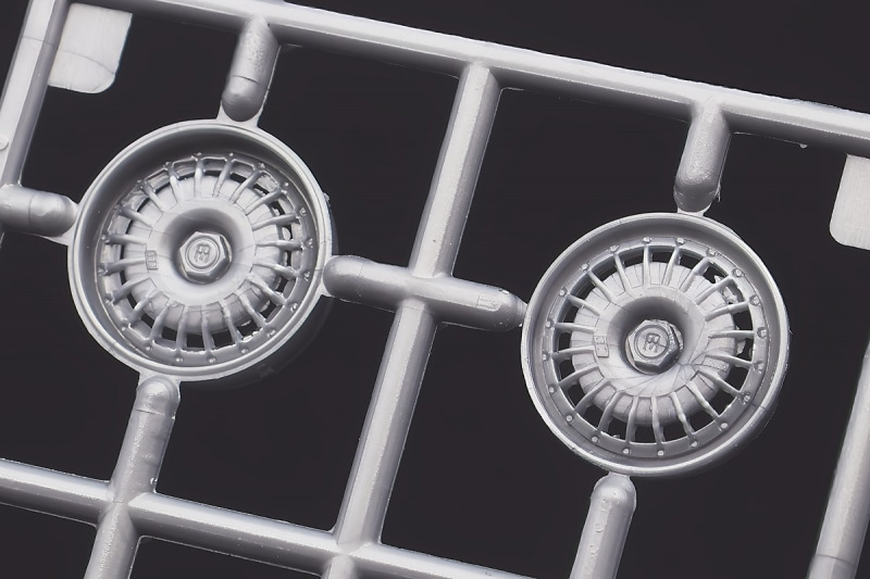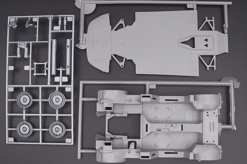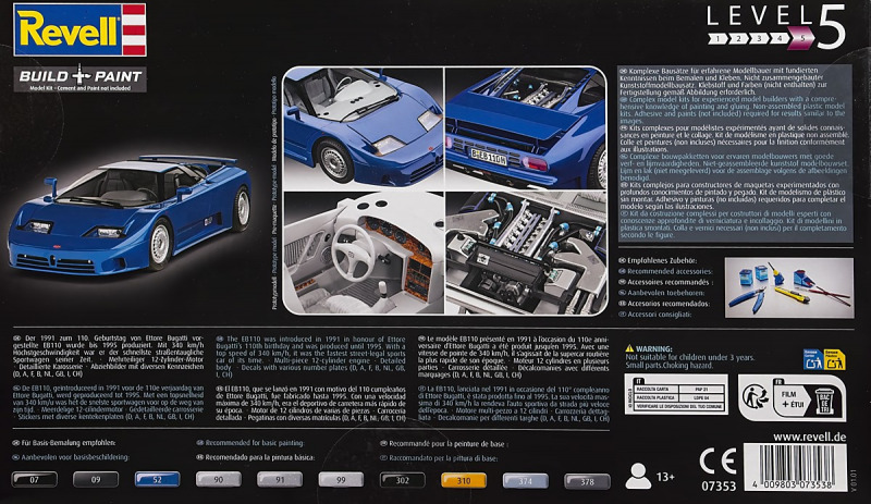 Revell hat sich ganz schön lange Zeit gelassen, den Bausatz des Bugatti EB110 mal wieder neu aufzulegen. "Ups I did it again" ist hier alles andere als zutreffend. Tatsächlich gab es ihn bisher nur einmal und er blieb auch nur wenige Jahre im Programm. Da schrieb am noch eine 19 am Anfang der Jahreszahl, so lange ist das schon her. Zwischenzeitlich hatte er sich zu einem begehrten Sammlerstück gemausert, mit entsprechenden Preisen. Nun kommt er im neuen Schachteldesign daher, mit neuem Decalbogen und aktueller Bauanleitung. An den Bauteilen hat sich erwartungsgemäß nichts geändert. Warum auch, der Bausatz war für damalige Verhältnisse echt top. Die 148 Bauteile sind in in drei Farben gespritzt, grau, blau und silber. Bei der Erstauflage war der Rahmen mit den Felgen noch verchromt, das hat man gottseidank hier bleiben lassen. Die Gussqualität ist so o-la-la, es gibt einiges an Fischhaut, Grate und auch ziemlich große Auswerferpins. Da kann der Bausatz seine 30 Jahre, die er auf dem Buckel hat, nicht ganz verleugnen. Demgegenüber kann der Bausatz mit einigen wirklich hervorragend gemachten Details aufwarten. So sind z.B. die Sitze die besten, die ich bis dato in einem 1:24er Bausatz vorgefunden habe. Man kann das edle Leder von Poltrona Frau quasi förmlich riechen beim Anblick der fein strukturierten Sitze. Auch der Rest vom Innenraum weiß zu überzeugen. Das Armaturenbrett strotzt geradezu vor Details. Das I-Tüpfelchen sind die Wurzelholz-Decals. Das kann Van der Rostens ihre Uschi auch nicht besser! Der aus fast 50(!) Bauteilen bestehende Motorraum verschwindet leider fast vollständig unter der Karosserie. Das gleiche gilt auch für die Achsen. Revell hat sich seinerzeit sehr viel Mühe mit diesen Details gegeben. Wenigstens kann man die recht große Klappe hinten öffnen, so sieht man wenigstens etwas von all der Pracht. Getrübt wird die Freude nur von der ganzen Vorarbeit, die man zum Versäubern der Teile leisten muss. Revell hat auch wieder eine ganze Reihe von Decals beigelegt, mit denen man den Motor dem Original noch ein weiteres Stückchen näher bringen kann. Auch die vordere Klappe kann man offen anbauen, darunter kommen dann z.B. die Hydraulik der Bremsanlage und die Batterie zum Vorschein. Die Reifen sind sehr schön gemacht. Sie haben ein originalgetreues Profil und es gibt erhabene Schriftzüge an den Flanken. Ich habe mal nachgemessen, die Originalreifen - vorne 245/40 R18, hinten 325/30 R18 - sollten umgerechnet für 1:24 einen Außendurchmesser von 27,2 mm haben. Die Bausatzreifen sind ca. 1 mm zu klein im Durchmesser. Die Breite passt in etwa. Die BBS-Felgen weisen stellenweise etwas Fischhaut in den Zwischenräumen auf. Schade, dass man durch die Felgen von der Bremsanlage am fertigen Modell kaum etwas sieht, denn diese ist ganz hervorragend wiedergegeben, einschließlich der gelochten Bremsscheiben. Die Vorderräder können beweglich (also mit Lenkeinschlag) angebaut werden. Wer sauber arbeitet, bekommt auch drehbare Räder hin. Die Klarsichtteile sind eher mäßig. Die große Frontscheibe hat eine ungleichmäßige Materialstärke was zu einer welligen Oberfläche führt. Nicht tragisch, aber das fertige Modell wirkt dadurch etwas ´billiger´. Die kleine, senkrechte Heckscheibe ist eher trüb, als wäre die Form nicht sauber poliert gewesen. Sieht man zwar kaum, weil sie unter der großen Heckklappe verschwindet, ärgerlich ist es aber trotzdem.