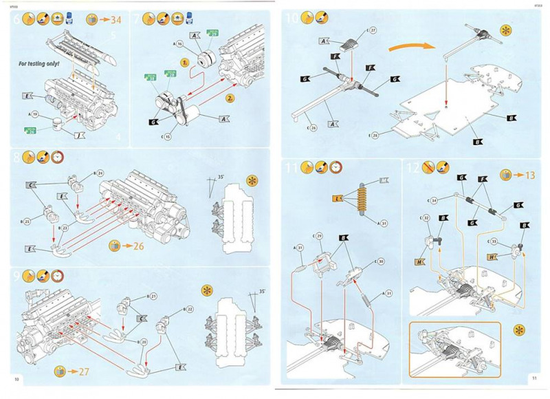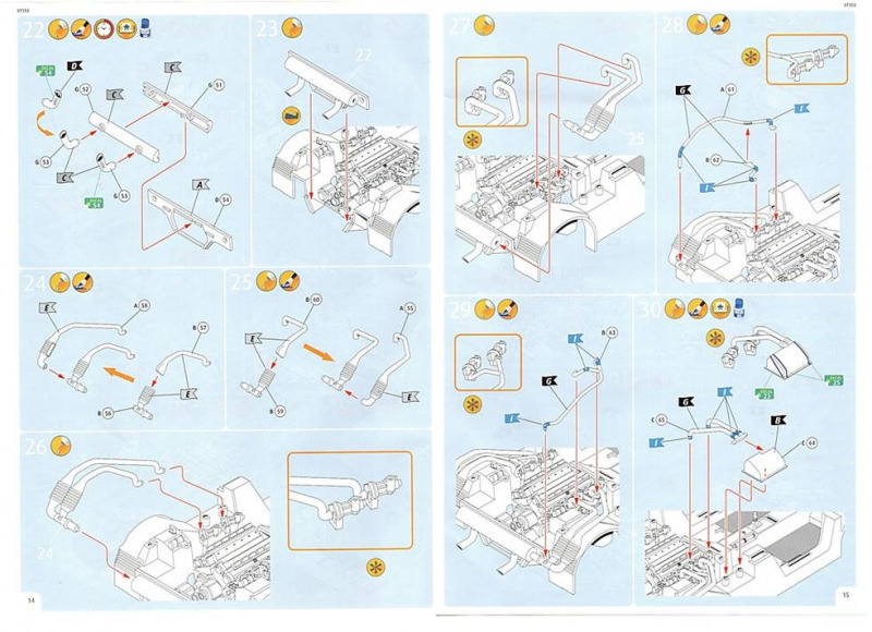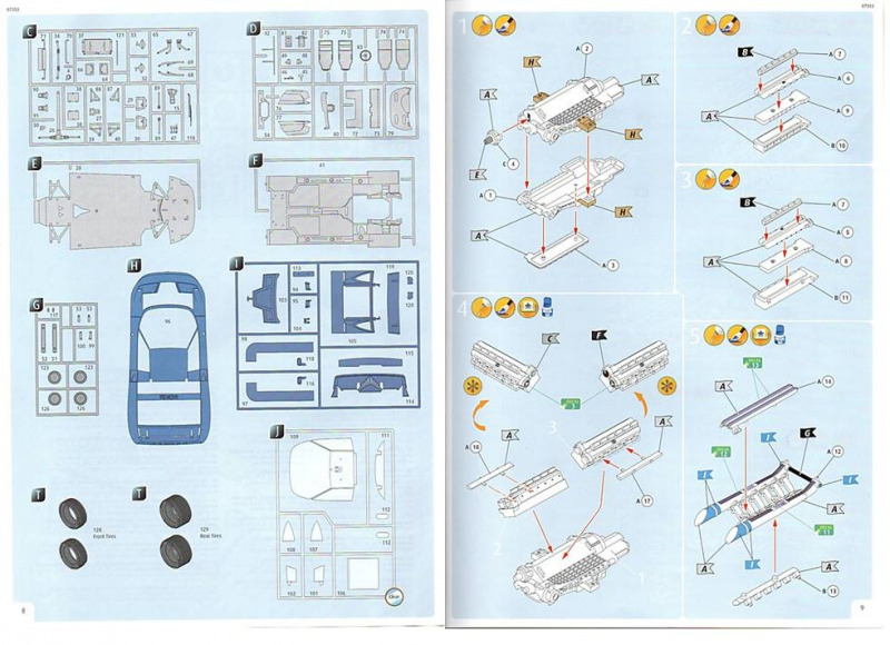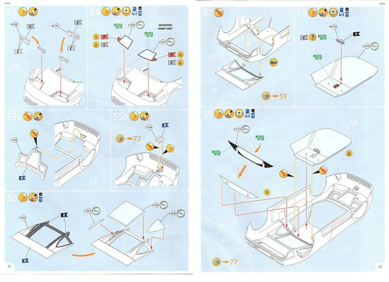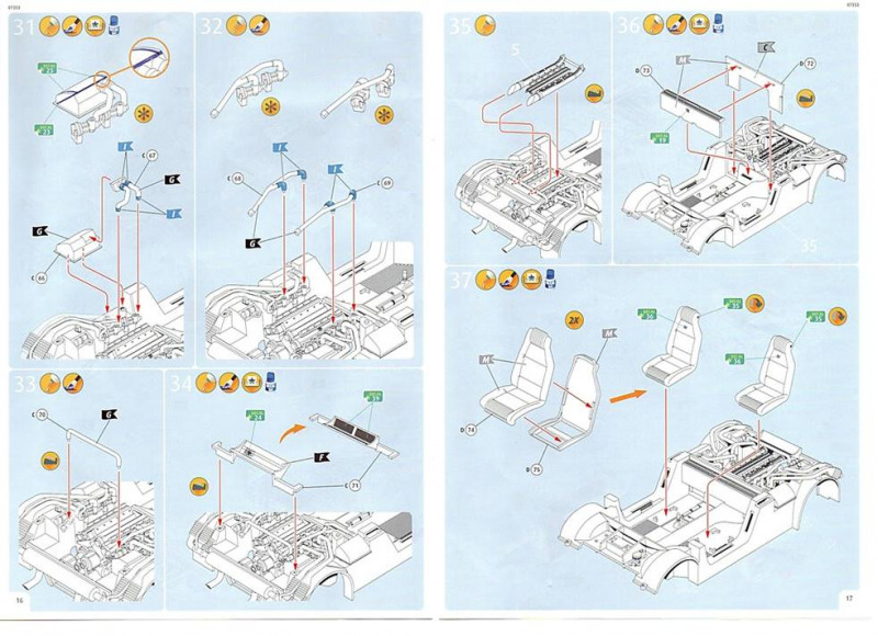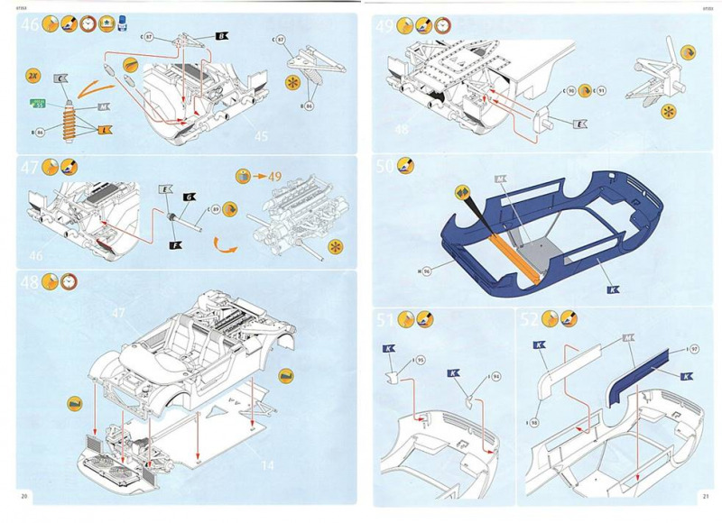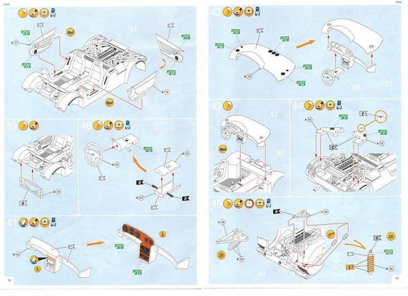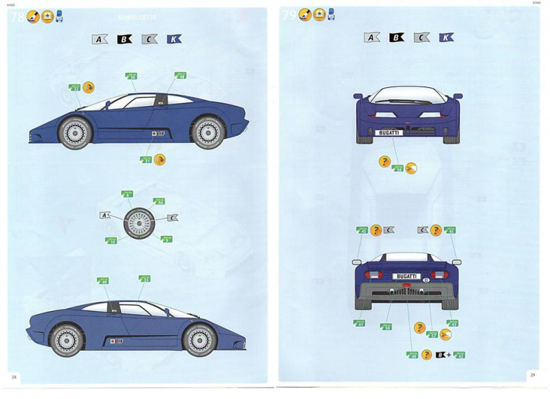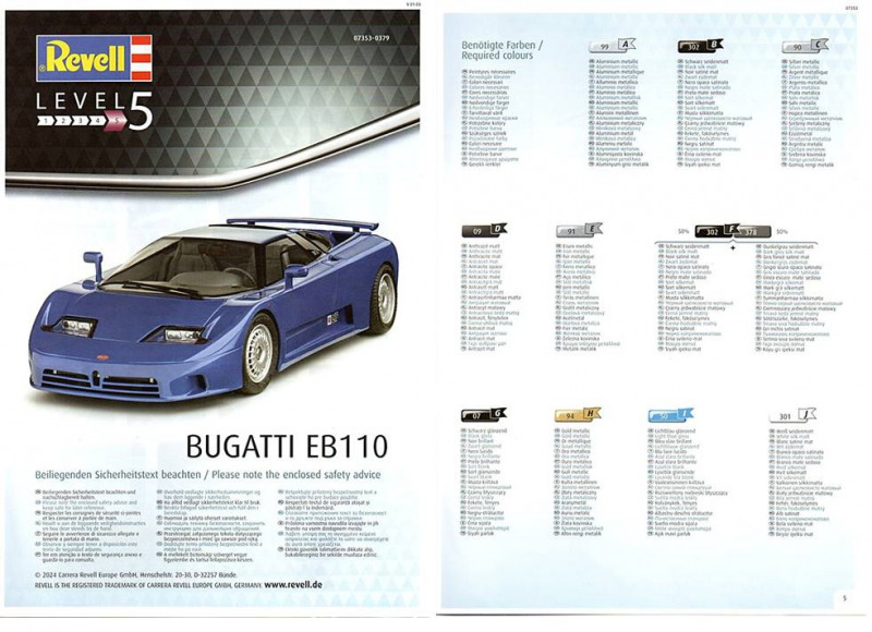 Dem Brett ist nichts mehr hinzuzufügen! Der 12 x 12 cm messende Decalbogen ist von der gewohnt guten Qualität printed by Cartograf. Er enthält eine ganze Reihe sehr nützlicher Decals, die das Modell weiter aufwerten. Besonders hervorzuheben sind die diversen Typenschilder und Plaketten sowie die Wurzelholz-Decals für das Armaturenbrett. Letzere sind super gelungen. Beim Angebot an Nummernschildern dürfte jeder was passendes für sich finden. Aber Obacht! Revell nimmt es mit der Authentizität von Nummernschildern nicht immer hundertprozentig genau. Die Bauanleitung ist mit 30 Seiten und 80 Baustufen mehr als umfangreich ausgefallen. Die einzelnen Baustufen sind daher seeehr übersichtlich, selten werden mehr als drei Bauteile gleichzeitig verbaut. Drei Seiten Bemalungsanleitung für einen Pkw findet man bei Revell auch eher selten (der zeitgleich erschienene Lambo-Bausatz muss sich mit einer Seite begnügen). Bis auf eine Farbe muss bei diesem Modell nichts zusammengemischt werden.