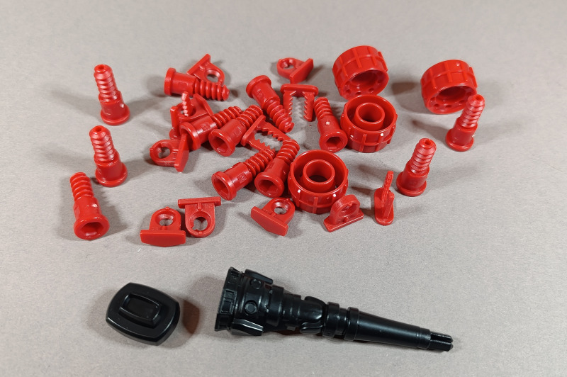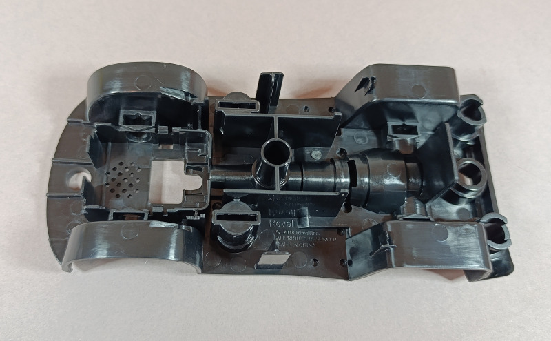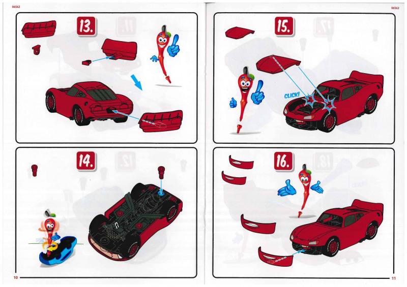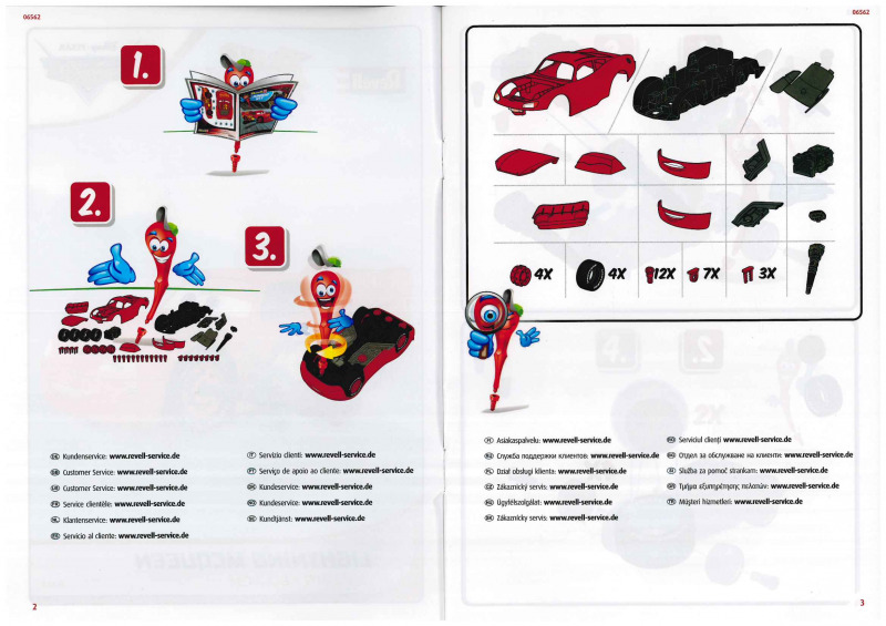 Der Karton ist ein deutlich stabilerer Stülpkarton, als man es sonst von Revell gewohnt ist. Er ist gut gefüllt, und die insgesamt 41 stabilen Bauteile sind in mehreren Tüten verpackt. Hinzu kommen die Anleitung sowie ein Bogen mit Stickern. Die Montage gestaltet sich denkbar einfach. Die meisten Teile werden zusammengesteckt oder mit großen Kunststoffschrauben verbunden. Als kindgerechter Schraubenzieher dient dabei die Kardanwelle, was ich für eine sehr gelungene Lösung halte, viele Designelemente erfüllen hier einen tieferen Zweck. Besonders gut gefällt mir die Darstellung des Motors; hier hat der Entwickler viel Liebe zum Detail bewiesen. Der Clou dabei: Der Motor ist zugleich das Herzstück der Elektronik, aus dem später die Sound- und Lichteffekte gespeist werden und in dem auch die Batterien untergebracht sind. Für den Batteriewechsel ist dann allerdings ein normaler Schraubendreher erforderlich. Mithilfe der drehbaren Frontscheibe, die bei Cars die Augen der Charaktere darstellt, sowie zweier unterschiedlicher Stoßstangen (in denen sich der Mund befindet), lassen sich zwei verschiedene Gesichtsausdrücke darstellen. Insgesamt machen alle Teile einen guten Eindruck und ermöglichen eine gelungene Darstellung von Lightning McQueen. Einige Bauteile lassen sich jedoch etwas schwer einklicken, etwa die Haltespangen oder die Felgen der Reifen, was für Kinderhände mitunter etwas fummelig sein kann.