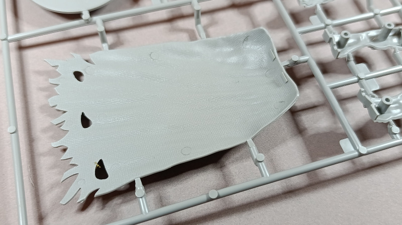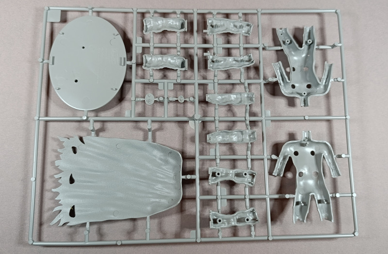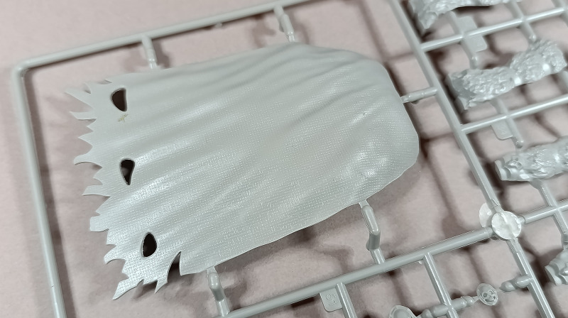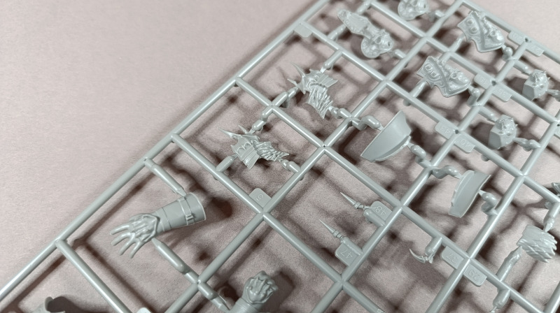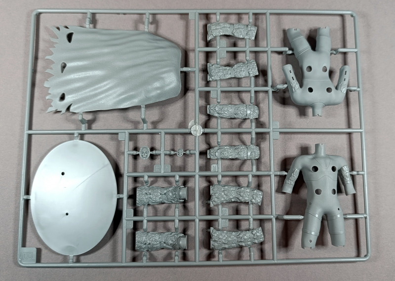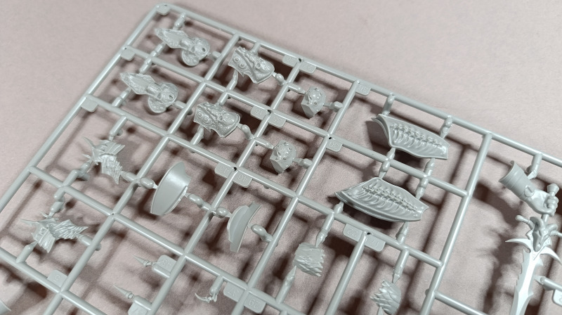 Kommen wir zum Plastik: Dem Bausatz liegen zwei Gussrahmen mit insgesamt 52 sauber gespritzten Teilen bei, dazu kommen der Sockel sowie ein separates Namensschild. Letzteres empfinde ich persönlich als eher unglückliche Lösung. Zum einen findet sich in der Mitte eine Art Sinkstelle, zum anderen bleibt in der Präsentation nur die Möglichkeit, es – ähnlich einem Namensschild auf dem Schreibtisch – separat daneben zu platzieren. Eine Kombination aus Namensschild und Sockel wäre hier vermutlich die elegantere Lösung gewesen. Der Sockel selbst, beziehungsweise der Sockelrahmen, liegt ebenfalls separat bei und macht qualitativ einen deutlich besseren Eindruck. Allerdings kippelt er leicht und sollte daher plan geschliffen werden, um einen sicheren Stand zu gewährleisten. Die Teile der Figur selbst verteilen sich auf zwei Gussrahmen. Wie nicht anders von einem New Tool zu erwarten, sind die Teile von hervorragender Qualität. Auf dem ersten Gussrahmen finden sich vor allem die hochdetaillierten Teile der Rüstung. Die Ornamente an den Schultern sind makellos ausgeführt, am Brustpanzer sind sogar leichte Dellen dargestellt, und auch die Stoffstruktur am Gurt weiß zu überzeugen. Der Helm ist mehrteilig aufgebaut und verdeckt den Großteil des Gesichts. Man muss schon etwas suchen, um dieses zu entdecken; es ist nur teilweise dargestellt, aber dennoch ausreichend wiedergegeben. Was mir ebenfalls aufgefallen ist, betrifft das Schwert: Dieses ist zwar sehr gut getroffen, allerdings fehlen die Runen, wie sie auf der Verpackung zu sehen sind. Hier wären zumindest ein paar Decals eine sinnvolle Lösung gewesen. Rahmen B beherbergt die grundlegenden Bauteile für den Körper. Dieser ist mit einer Riffelstruktur überzogen, die vermutlich die Ringrüstung darstellen soll. Die Idee ist grundsätzlich sehr gelungen, erschwert jedoch das Versäubern der Klebenaht erheblich – vor allem dann, wenn man die Struktur nicht zerstören möchte. Ein vollständiges Nachgravieren wäre jedenfalls eine Herkulesaufgabe; möglicherweise fällt am Ende aber auch kaum noch etwas davon auf. Die Fellrüstung ist strukturell angedeutet, wirkt jedoch etwas zu glatt, wodurch der Plastiklook leider durchscheint. Hier könnte es helfen, die Oberfläche leicht aufzurauen oder – sofern vorhanden – echtes Fell im passenden Maßstab zu verwenden, was durchaus gut umsetzbar wäre. Der Umhang zeigt wiederum eine überzeugende Stoffstruktur, allerdings verraten die Löcher recht deutlich seine Materialstärke. Zudem wirken diese etwas zu akkurat; mit etwas ausgefransteren Kanten käme der Effekt vermutlich noch besser zur Geltung.