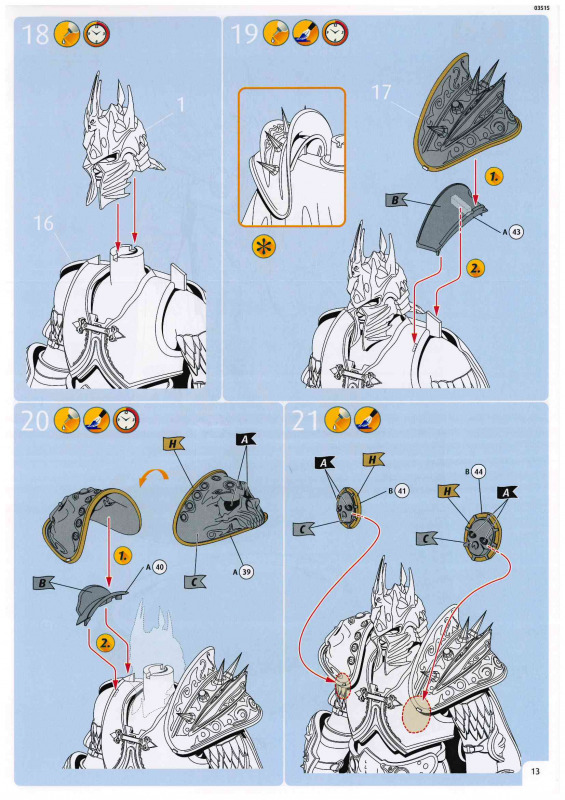 Bemalung und AbziehbilderDie Abziehbilder geben den Schriftzug „Lich King“ lediglich in zwei verschiedenen Ausführungen wieder. Wie bereits erwähnt, wären zusätzliche Runen für das Schwert wünschenswert gewesen. Bei der Bemalung empfiehlt sich eine genaue Recherche. Mir scheint, dass man hier in Bünde nicht allzu sorgfältig gearbeitet hat und die Vorbildrecherche etwas oberflächlich ausgefallen ist. So soll der Umhang laut Anleitung blau bemalt werden, obwohl es sich beim Vorbild eher um einen sehr dunklen, nahezu schwarzen Farbton handelt. Auch die Handschuhe sind mit Staubgrau angegeben, während meine Recherchen eher auf einen dunklen Lederton hindeuten. Gleiches gilt für die Gesichtsfarbe, die ebenfalls nicht ganz stimmig wirkt. Wer also Wert auf eine möglichst korrekte Darstellung legt, dem ist dringend zu empfehlen, die Farbgebung anhand eigener Recherchen zu überprüfen und gegebenenfalls anzupassen.