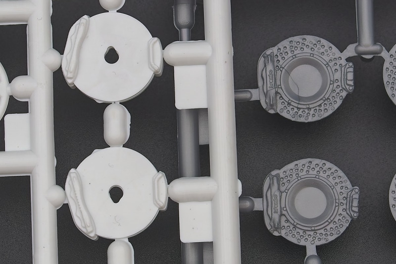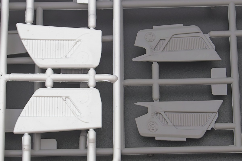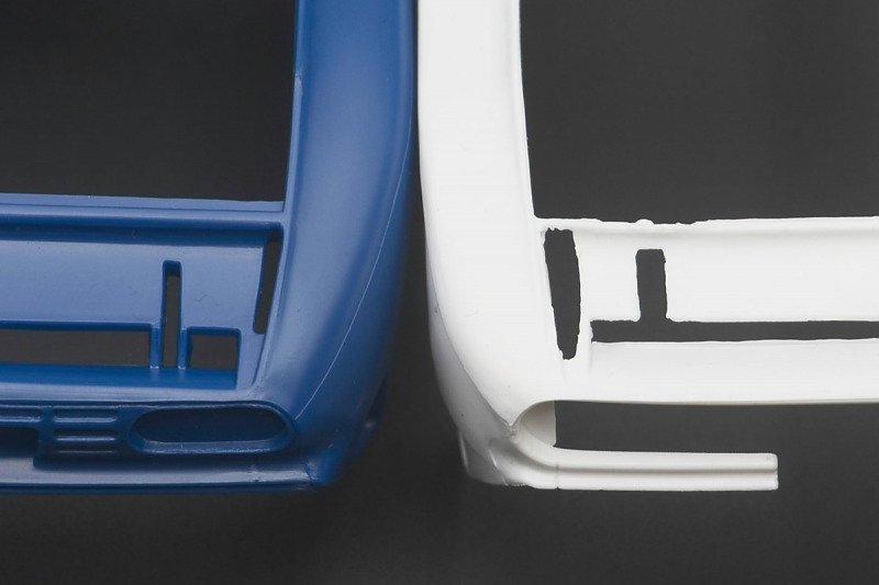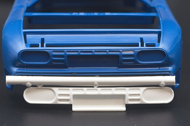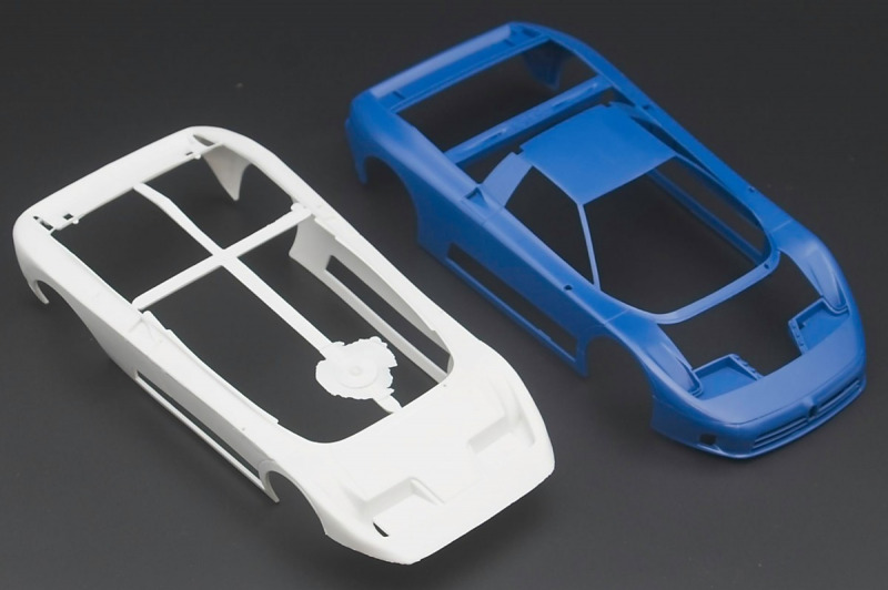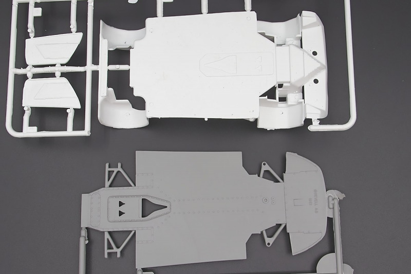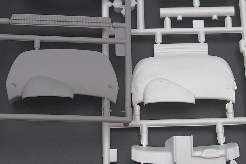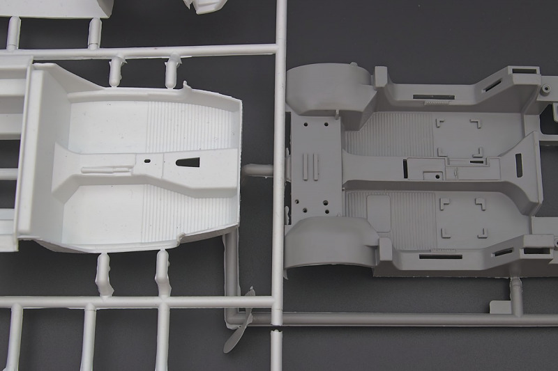 Während bei Revell die Front- und Heckschürze bereits am Karosserieteil vorhanden sind, muss man diese bei Heller separat anbauen. Dadurch ist das Rohteil sehr filigran, was sich durch einen leichten Verzug bemerkbar macht. Unterschiede im Detail gibt es sowohl vorne als auch hinten. Bei Heller gibt es vorne nur zwei anstelle von drei Schlitzen, außerdem ist das Bugatti-Emblem deutlich breiter. Revell hat das wesentlich besser getroffen. Am Heck liegt der Unterschied in den Rücklichtern, bei Heller sind sie höher als bei Revell. Da geht der Punkt für mich an Heller. Bei beiden Modellen kann die Heckklappe beweglich angebaut werden, um den darunter liegenden Motor zu betrachten. Revell bietet zusätzlich eine zu öffnende Fronthaube, wo man z.B Batterie und Bremsanlage bestaunen kann - Punkt für Revell. Die Türen bleiben bei beiden Modellen leider zu. Revell bietet im Gegensatz zu Heller noch einen ausgefahrenen Heckspoiler an.