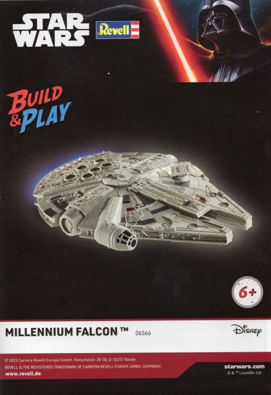 Auch beim Millennium Falcon setzt Revell konsequent auf das Build-&-Play-Prinzip. Für mich heißt das ganz praktisch: keine Farbe, kein Kleber und kein langwieriger Aufbau. Die Teile werden zusammengesteckt, und schon nach kurzer Zeit steht das fertige Modell vor einem. Der Bausatz richtet sich klar an Kinder, Einsteiger und Fans, die ohne großen Aufwand ein fertiges Modell mit zusätzlichen Effekten haben möchten. Mir gefällt dabei besonders, dass der Falcon dank Licht- und Soundfunktionen nicht nur im Regal steht, sondern richtig Aufmerksamkeit auf sich zieht. Laut Revell liegt der Maßstab bei 1:164, die Teilezahl ist bewusst überschaubar gehalten, und die Altersempfehlung beginnt bei 6 Jahren.