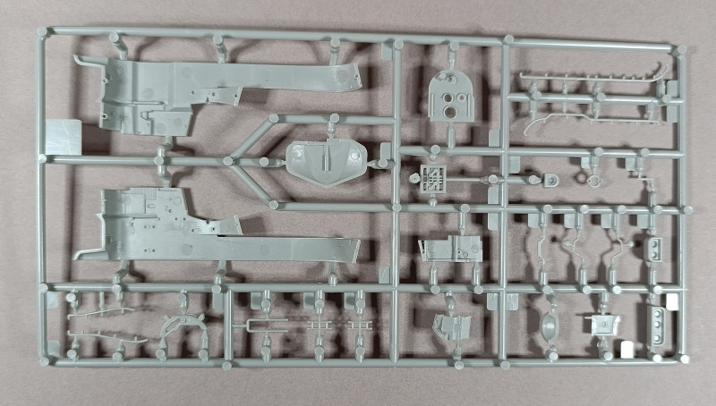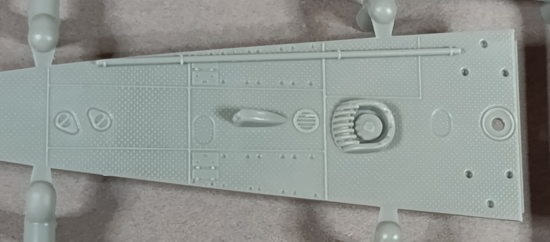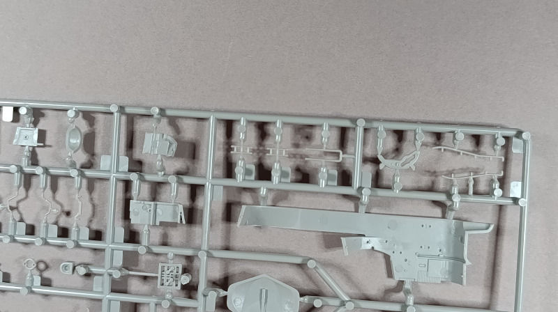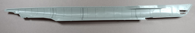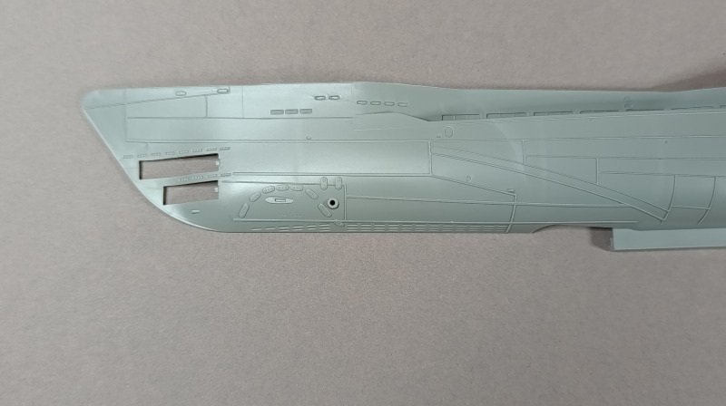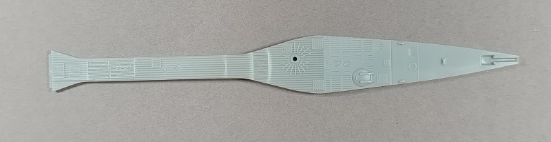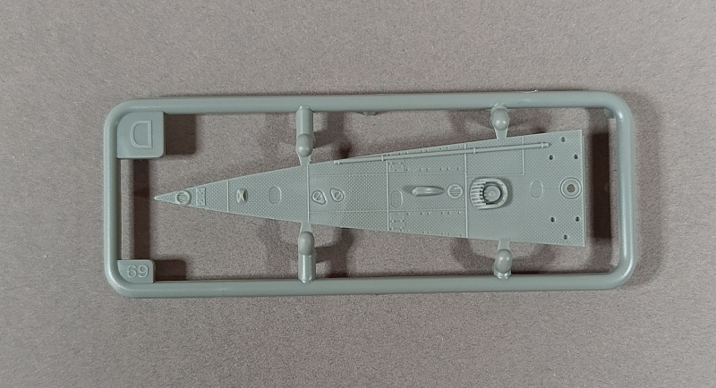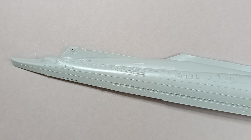Der Bau beginnt mit den Torpedoklappen, die allerdings nur rudimentär dargestellt sind. Anschließend werden drei Querspanten zur Stabilisierung eingesetzt, bevor die beiden Rumpfhälften miteinander verbunden werden. Mit einer Länge von 53,1 cm entspricht das Modell dem Original maßstäblich sehr genau, was in Zeiten von CAD allerdings keine große Herausforderung mehr darstellt. Im Vergleich zum 1:72-Bausatz wirkt es zudem so, als sei das Modell im Wesentlichen herunterskaliert worden. Die Schweißnähte am Rumpf sind erhaben, jedoch etwas zu prominent ausgeführt. Wer möchte, kann sie leicht herunterschleifen, ansonsten muss man damit leben. Die Flutschlitze sind versenkt und ausreichend tief dargestellt, lediglich die oberhalb des Hecktorpedos wirken etwas schwach und könnten nachgraviert werden. Die Torpedoausstoßöffnung kann offen oder geschlossen gebaut werden. Auch der Schacht für den Schnorchel wird in diesem Bauabschnitt eingesetzt. Die Passung des Rumpfes ist sehr gut und mit ein paar Klemmen problemlos zu bewältigen. Das Deck ist dreiteilig ausgeführt, zwei Teile liegen separat bei, eines befindet sich am Gussrahmen. Vereinzelt scheint der Mittelteil verzogen zu sein, bei meinem Exemplar war jedoch alles in Ordnung. Die Deckstrukturen, insbesondere am Bug, sind hervorragend getroffen und dürften selbst mit PE-Teilen kaum besser darstellbar sein. Auch hier überzeugt die Passung. Vor dem Einsetzen des Mittelteils muss der Schnorchel montiert werden; laut Anleitung soll er ohne Klebstoff eingesetzt werden und bleibt dadurch beweglich.