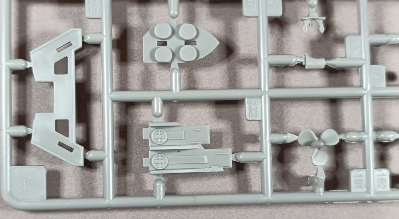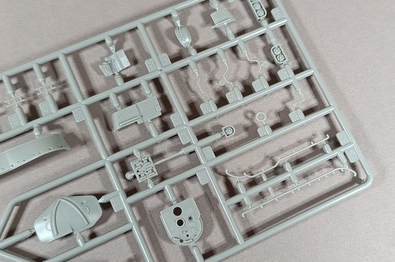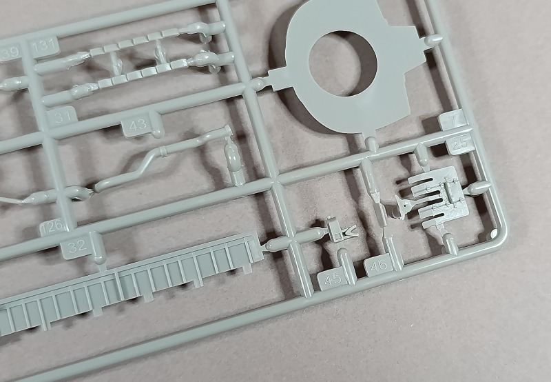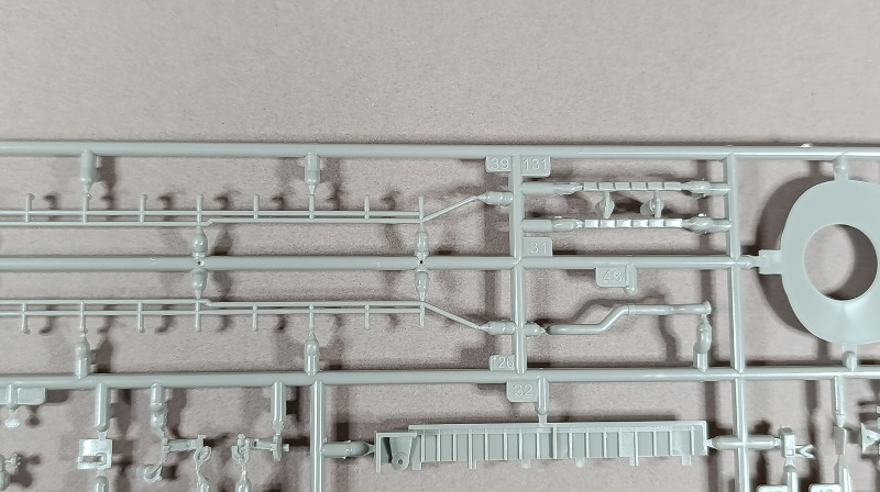 Der Turm ist zumindest laut dem Detailset-Hersteller RC-Subs nicht ganz korrekt dargestellt. Offenbar hat Revell sich hier an der U-505 orientiert, wodurch einige Details nicht exakt zur U-190 passen. In diesem Zusammenhang stellt sich durchaus die Frage, warum man nicht direkt die U-505 umgesetzt hat. Unabhängig davon weiß das Gebotene jedoch zu gefallen. Die Oberflächenstrukturen sind fein dargestellt. Die Seitenteile sind mittig geteilt und werden zusammengesetzt, das obere und untere Turmdeck separat eingeklebt, auch hier überzeugt die Struktur. Weniger gelungen sind die fehlende Darstellung des Sterns an den Flak-Geschützen sowie die etwas zu massiv ausgeführten Halterungen für das Balkongeländer. Die Turminnenseite liegt separat bei, ebenso Luken, Leiter und Rettungsring. Auch Periskope und Funkmasten sind enthalten. Der größte Kritikpunkt ist jedoch das FuMO 30-Radar (Bauteil J34). Die Darstellung wirkt nach heutigen Maßstäben deutlich zu grob und zieht meiner Meinung nach das Gesamtergebnis spürbar herunter. Hier empfiehlt sich auf jeden Fall ein Austausch durch ein filigraneres Ersatzteil.