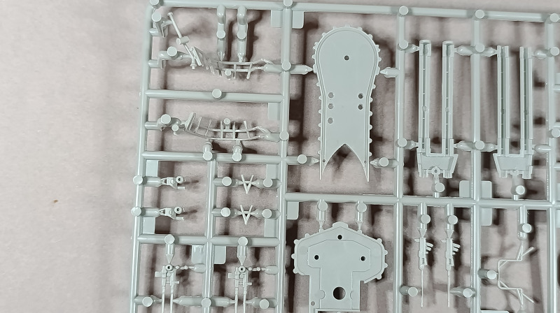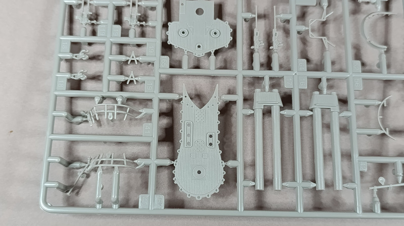 Nach dem Zusammenfügen des Rumpfes werden noch kleinere Bauteile ergänzt. Am Bug sind dies der Anker, zwei seitliche Leitflossen sowie eine weitere Flutschlitzöffnung. Am Heck folgen Schrauben, Ruder und ebenfalls Leitflächen. Die Teile sind sauber ausgeführt und ausreichend detailliert. Die vorderen Torpedoklappen können wahlweise geöffnet oder geschlossen dargestellt werden. Auf dem Oberdeck kommen weitere Kleinteile wie Poller und Gestänge für die Takelage hinzu. Der beiliegende Ständer ist schlicht gehalten. Andere Hersteller sind hier zwar kreativer, doch die einfache Konstruktion aus vier Teilen mit separatem Namensschild ist zweckmäßig und lässt sich mit einer passenden Bemalung durchaus ansprechend gestalten.