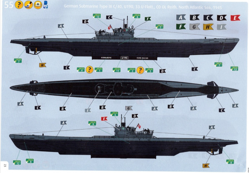 Als Abziehbilder liegen unter anderem die Kennungen für U-190, Flaggen sowie der grüne Stern als Schiffswappen bei. Ergänzt werden diese durch die Tiefgangsmarkierungen. Gedruckt wurden die Decals, wie inzwischen üblich, in Italien und machen einen sauberen Eindruck. Wie bereits erwähnt, sind zwei Varianten darstellbar:
