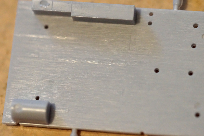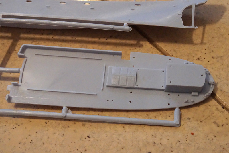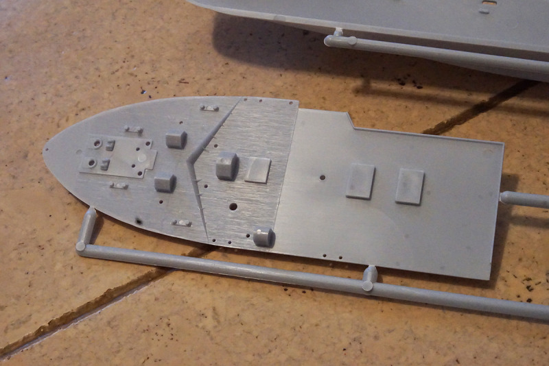 Hand bzw. den Bohrer anlegen sollte man an den am Deck angegossenen Aufbautenwänden, hier sind keinerlei Bullaugen, Fenster oder Türen nachgebildet. Die Bemalungsanleitung hilft bei der Eigeninitiative etwas weiter (ebenso wie die Vorbildfotos auf o.g. Webseite). Die Fensteröffnungen an Brücke und Rumpf sind bausatzseitig bereits durchbrochen, Material für eine „Verglasung“ liegt jedoch nicht bei; ebensowenig wie Takelgarn: hierfür sind aber an den entsprechenden Teilen die benötigten Löcher bereits angelegt.