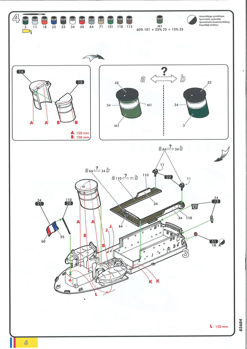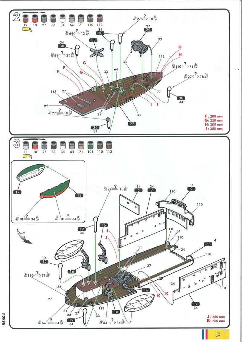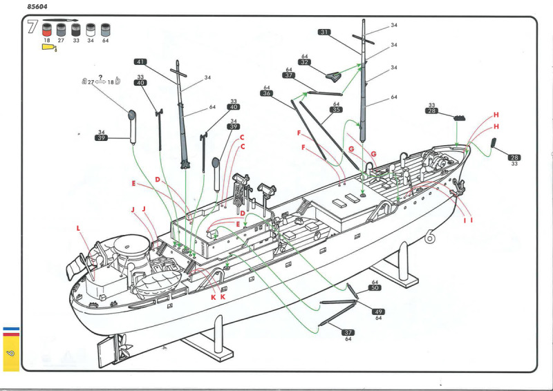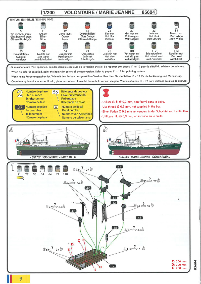 Abschließend gibt es die Bemalungs- und Dekorationsanleitung für beide Schiffe – allerdings nur für die Steuerbordseite und die Draufsicht -, wobei Marie-Jeanne das etwas farbenfrohere ist. Zu beachten sind unbedingt die Decals 1/2 bzw. 6/7 (Namenszüge und Registrierungen): nach Vorbildfotos steht bugwärts der Namenszug, dann die Registrierung; dies bedeutet also eine (entgegen der Anleitung) seitengetauschte Anbringung der Bilder. Weitere Aufmerksamkeit erfordert der beschriebene weiße Rumpfabschluss am Heck: denkt man sich diese Angabe auf die Backbordseite weiter, müsste logischerweise der weiße Streifen – durch den Umbau bedingt – bis ins vordere Backbordviertel des Rumpfes gezogen werden: sieht recht seltsam aus. Ein farbiges Vorbildfoto von Volontaire zeigt jedoch, dass es in diesem Bereich keinen weißen Absatz gab und die dunkelgrüne Rumpffarbe bis an die Deckskante hochgezogen war – Problem gelöst. Die Farbangaben beziehen sich allein auf die Heller-Palette.