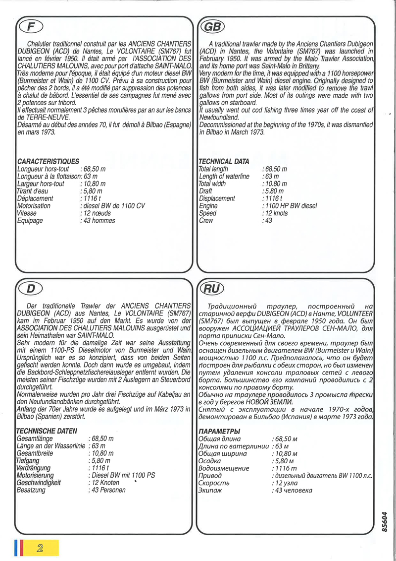 Marie-Jeanne und Volontaire sind (der Bauanleitung nach) Schwesterschiffe, die auf der Werft Anciens Chantiers Dubigeon (ACD) in Nantes gebaut wurden. Volontaire (SM.767) wurde nach der Ausrüstung bei Association des Chalutiers Malouins im Februar 1950 abgeliefert, der Heimathafen war Saint Malo, der Betreiber die Association des Tralutiers Malouins. Modern für die damalige Zeit war die Ausstattung mit einem 1.100 PS Dieselmotor von Burmeister & Wain. Ursprünglich war das Schiff so konzipiert, dass von beiden Seiten gefischt werden konnte, bei einem Umbau hat man aber die Backbord-Schleppnetzausleger entfernt. Üblicherweise wurden drei Fischzüge pro Jahr auf Kabeljau zu den Neufundlandbänken gefahren. Im Jahr 1970 wurde die Volontaire stillgelegt und im März 1973 in Bilbao (Spanien) abgewrackt. Vorbildfotos von Volontaire findet man hier. Über die Marie-Jeanne ist nichts dergleichen dokumentiert, verschiedenen Quellen zufolge darf man sie als „Fantasiegebilde“ einordnen. Man kann dieses Schiff jedoch - ohne konkretes Vorbild - als Beispiel für diesen damals an der französischen Atlantikküste offenbar häufig zu sehenden Schiffstyp betrachten, wobei der Umbau zum Fischen allein von der Steuerbordseite aus in Frage gestellt werden darf; der Ansatz zu einem entsprechenden „Rück“bau ist hier (weiter unten) zu sehen.