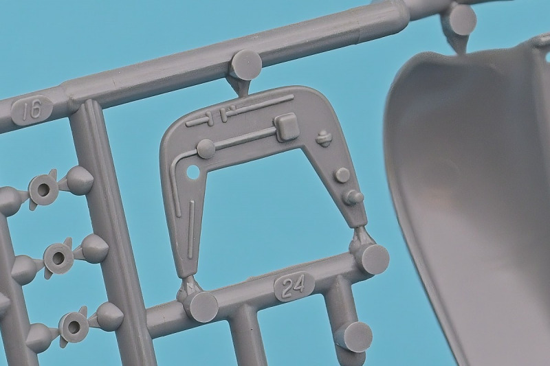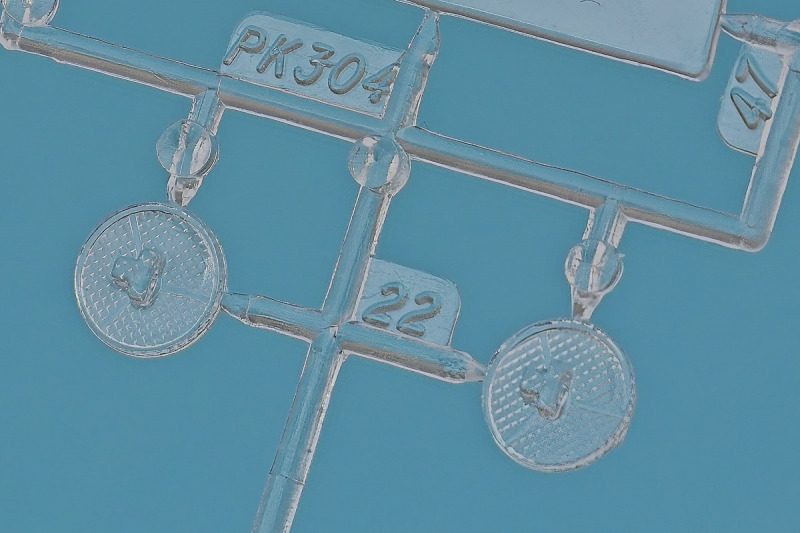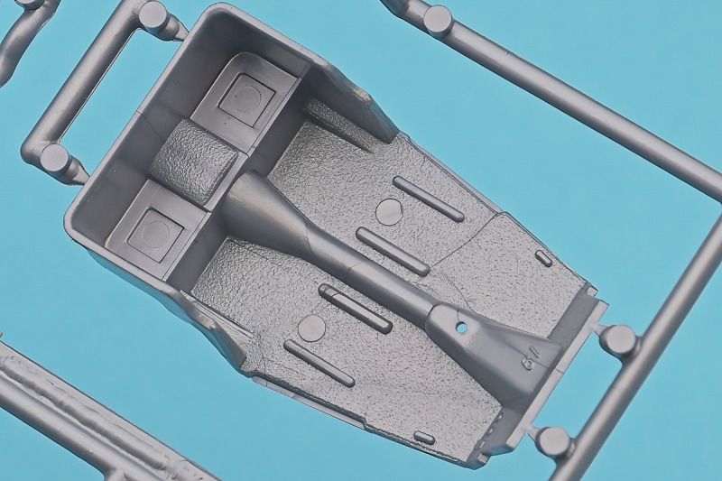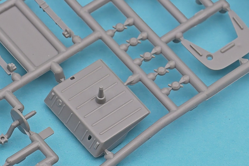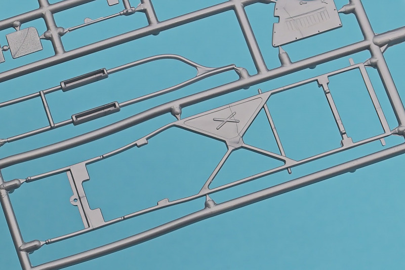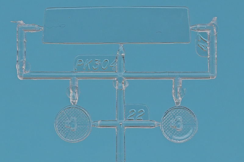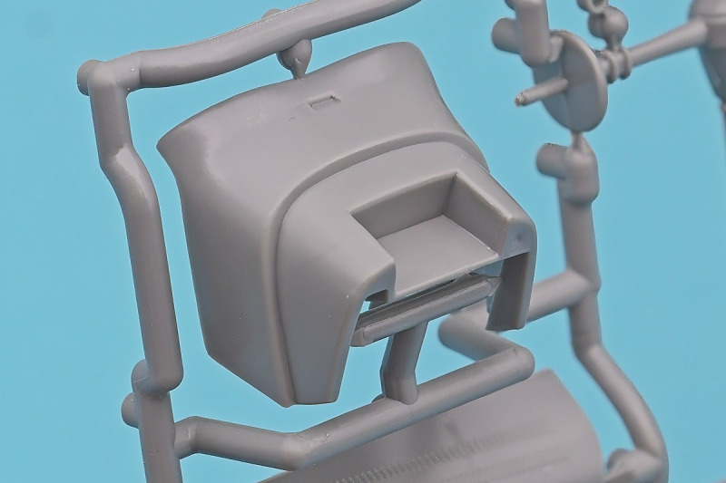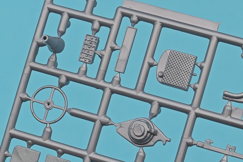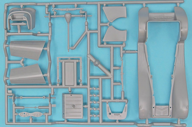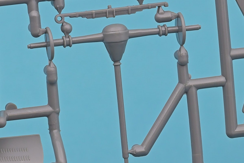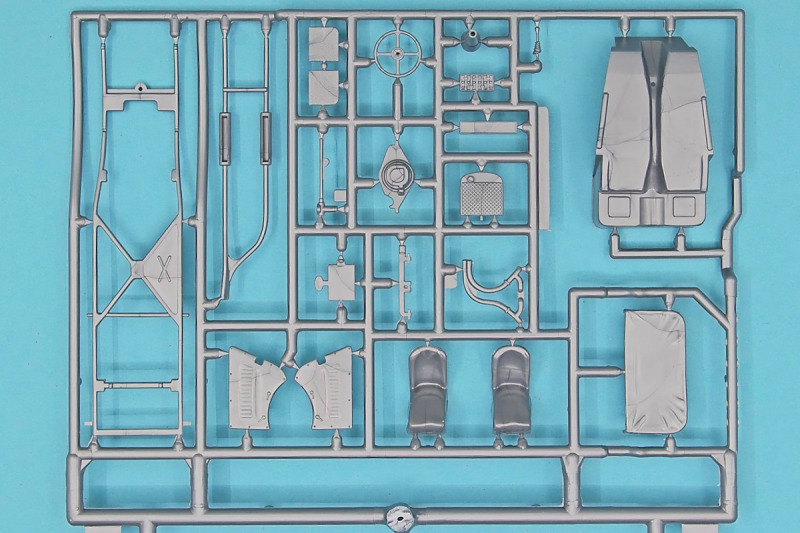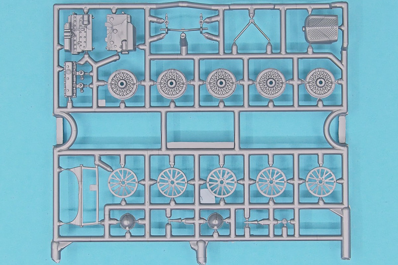 Die knapp über 70 Bauteile wirken beinahe etwas verloren in der Schachtel. Die Gussqualität ist recht gut, bis auf den üblichen Grat gibt es hier nichts anzumerken. Der Zusammenbau beginnt mit dem aus sieben Teilen bestehenden Motor. Dieser kann später am Modell noch gezeigt werden da die Motorhaube nur aufgelegt wird. Natürlich ist dies sehr vereinfacht, denn beim Original sind das vier, mit Klavierbändern verbundene Einzelsegmente. Das in 1:32 beweglich zu machen dürfte eine spannende Herausforderung sein. Den Riemen, hier als Decal kann man weglassen, den sieht man am Original so gut wie nie (die Haubenteile werden durch Rändelschrauben fixiert). Der Rahmen ist einteilig und man braucht nur die aus jeweils drei Teilen bestehenden Achsen mit den Blattfedern anzubauen. Die Räder können später drehbar aber nicht lenkbar angebaut werden. Die Speichenräder sind sicherlich ein Schwachpunkt am Modell. Besser war das seinerzeit aber nicht zu machen. Da hilft es dass die Speichen am Ende schwarz bemalt werden. Die Reifen sind aus Weichplastik und müssen ein wenig bearbeitet werden da es etwas Grat an den Kanten gibt. Den Dunlop Schriftzug gibt es nur auf einer Seite. Der Innenraum ist sehr schön wiedergegeben. Es gibt unterschiedliche Texturen für die mit Teppich belegten Bereiche. Die Sitze weisen einen einfachen Faltenwurf auf und es gibt ein paar erhabene Details an den Türverkleidungen. Die Türen selbst sind separat ausgeführt, können aber nicht beweglich angebaut werden. Das Armaturenbrett hat erhaben geprägte Instrumente für die auch ein passendes Decal vorhanden ist. Ein paar Anbauteile vervollständigen das Modell. Die Scheibe sollte man durch eine passende Folie austauschen da sie nicht ganz schlierenfrei ist. Die Gitter vor den Scheinwerfen sind mit auf den Leuchtengläsern, auch keine ideale Lösung.