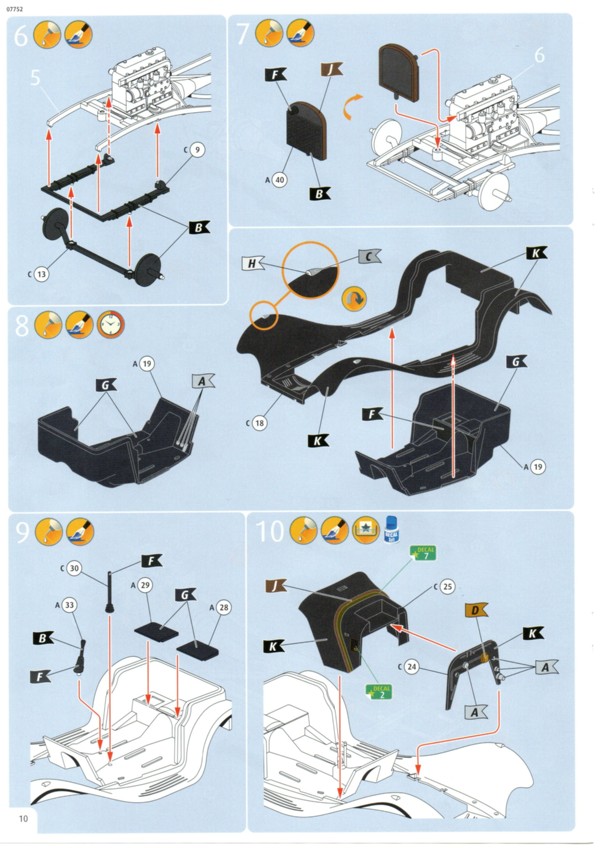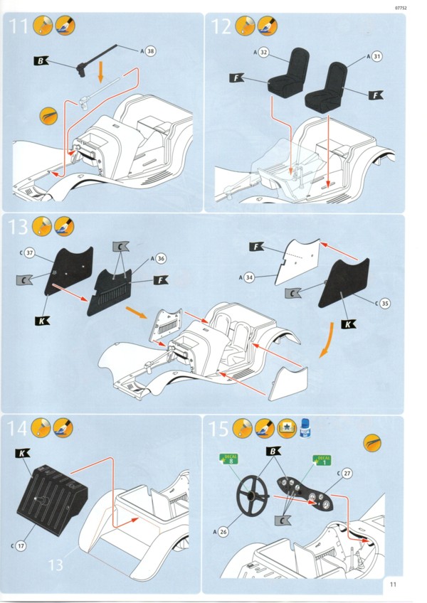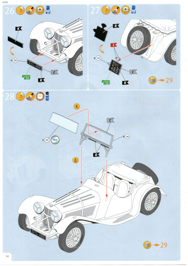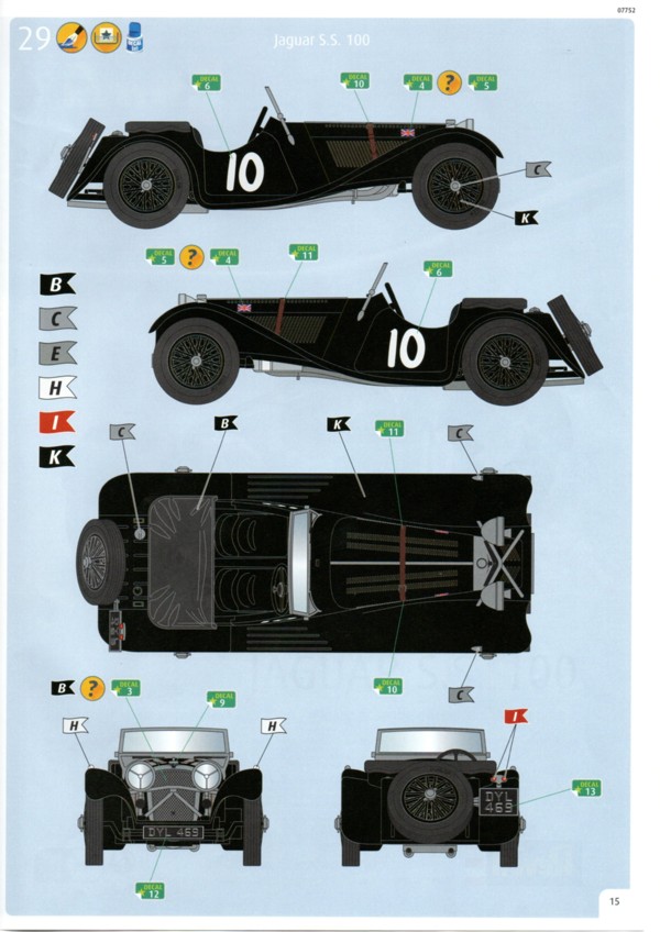 Der Decalbogen ist sehr übersichtlich ausgefallen. Gerade einmal 15 einzelne Decals sind auf dem sauber gedruckten Bogen enthalten. Die Teile für den Kühlergrill und den Riemen der Motorhaube hätte man auch weglassen können. Was Decal 7 darstellen soll erschließt sich mir nicht so ganz. Auf Originalfotos ist nichts Derartiges zu erkennen. Die Bauanleitung ist wie üblich sehr übersichtlich und hier auch nicht allzu umfangreich. Warum Revell den Bausatz mit dem Schwierigkeitsgrad 5 einstuft ist nicht ganz nachvollziehbar. Das Fahrzeug dass sich Revell zum Vorbild genommen hat existiert tatsächlich. Es ist ein Modell 1937 und trägt die Fahrgestellnummer 18105. Es wurde seinerzeit als Rennfahrzeug eingesetzt und gehörte Bob Truett, einem recht erfolgreichen Amateurrennfahrer aus London. Der Wagen wurde mit einigen Modifikationen versehen und konnte gut mit den stärkeren 3,5L Fahrzeugen mithalten. Es gibt eine ganze Reihe von Fotos im Internet an denen man sich für eine exakte Replik orientieren kann. Streng genommen müsste man für dieses spezielle Fahrzeug einige Dinge ändern, wie z.B. die Abgasrohrführung und die Bohrungen zur Gewichtsersparnis am Rahmen. DYL 469 ist komplett Schwarz, innen wie außen. Da muss man mit verschiedenen Schattierungen und Glanzgraden spielen um etwas Leben in das Modell zu bringen. Darstellbare Fahrzeuge: