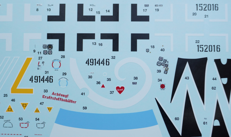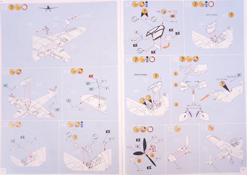 - Es fehlen Hinweise, welche der beiliegenden Bauteil-Variantenfür welche Markierungsoption korrekt sind, beispielsweise die Montage zweier verschiedener Seitenruder in Baustufen 38 und 39 (Spritzlinge M bzw. N) oder die Erlauhauben Bauteile 58 bzw. 59 in Baustufe 67.
