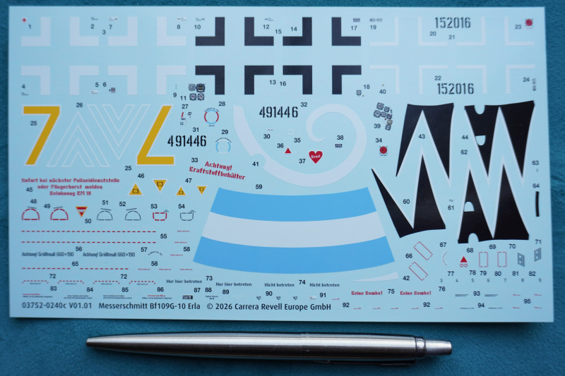 Die Bf 109 G-10 war kein komplett neues Flugzeug, sondern eine Art "Notprogramm" in der Spätphase des Zweiten Weltkriegs, um die Leistung der G-Serie an die überlegenen alliierten Jäger anzupassen. Die Bf109G-10 ‘Erla’ war schnell, kompakt, durchdacht. Sie kombinierte oft Rümpfe der G-Serie mit dem leistungsstarken DB 605 D Motor. Die Bezeichnung "Erla" bezieht sich auf die Erla Maschinenwerke in Leipzig. Charakteristisch für diese Produktion war die asymmetrische, stromlinienförmige Motorverkleidung, die nötig wurde, um die Leitungen und Aggregate des größeren Motors unterzubringen. Im vorliegenden Kit von Revell lässt sich auch Major Erich Hartmanns Maschine bauen - das Flugzeug des Piloten, der mit 352 Luftsiegen Geschichte schrieb.
