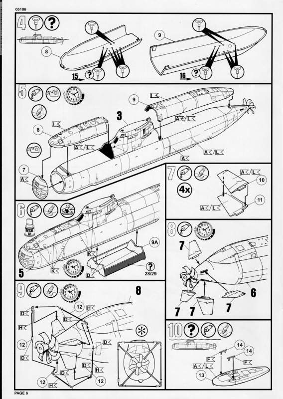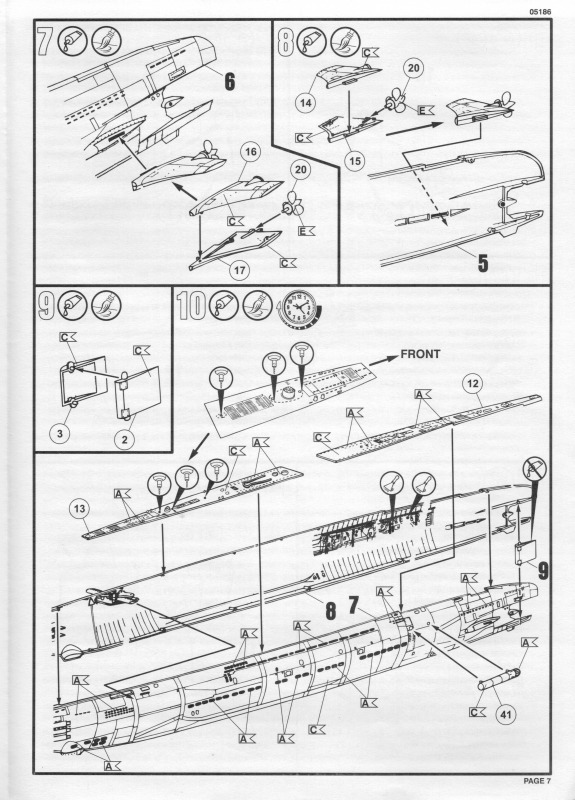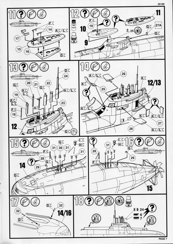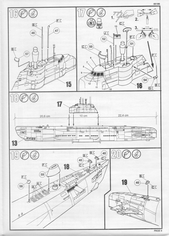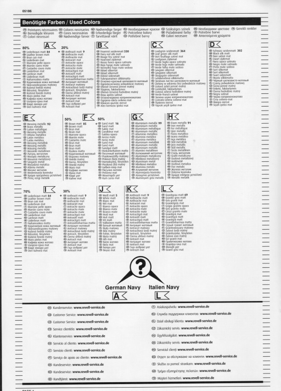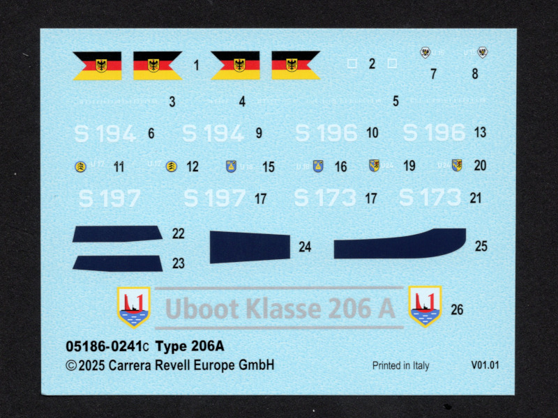 Die BauanleitungAuch diese Bauanleitung ist wieder in A4 und s/w gedruckt. Bis auf unwesentliche Details ist sie identisch zur Anleitung der vorherigen Auflage. Sie besteht aus acht Seiten und führt in 19 Schritten zum fertigen Modell. Der Markierungsbogen ist neu angeordnet und erlaubt die Darstellung der u.g. Unterseeboote der deutschen Marine während der Erprobung und nach der Indienststellung. Außerdem ist eine nicht spezifizierte Version der italienischen Marine möglich. Wie bei den anderen Bögen auch, so sind hier die Markierungen matt und augenscheinlich ohne Fehler gedruckt. Da die U-Boote seit einigen Jahren im Dienst sind kann es sein, dass die Markierungen in Größe und Platzierung sich inzwischen von den Bausatzvorlage unterscheiden. Wer also ein aktuelles Erscheinungsbild seines Modells bevorzugt, muß selbst recherchieren.