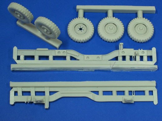 Der Bausatz:Bei dem Modell handelt es sich um einen Resin-Komplettbausatz. Verpackt ist das Ganze in einer soliden Pappschachtel mit einigen Farbfotos eines gebauten und bemalten Modells als Deckelbild. Zur Sicherheit beim Transport ist die Schachtel mit Schaumstoffchips gefüllt. Die Teile sind, sortiert nach Baugruppen, in einer Reihe von Plastiktüten verpackt. Der Bausatz besteht aus 113 hellgrauen Resinteilen, einem kleinen Gießast mit transparenten Scheinwerfergläsern, einem Satz Fotoätzteilen, einem Bogen Naßschiebebildern und einem durchsichten Stück Plastik für die Windschutzscheiben. Oben auf findet sich eine wirklich gut gemachte Bauanleitung. Sie ist schon fast so gut wie bei Spritzgußbausätzen. Zuerst werden alle vorhandenen Teile mit Namen, Anzahl und Bild dargestellt, gefolgt von einigen allgemeinen Bastelhinweisen. Die eigentliche Anleitung umfasst 5 Seiten. Ansichten aus verschiedenen Winkeln helfen beim richtigen Positionieren der Teile. Farbangaben sind ebenfalls enthalten. Werfen wir nun mal einen näheren Blick auf den Bausatz: