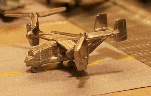 Die V22 liegt in einem extra Säckchen bei. Rumpf, Flügel, Motoren und Rotoren lagen lose darin, die Fahrwerke an einem Gussgrat. Der Metallspritzguss muss natürlich anders behandelt werden als Kunststoff. Das Entgraten erfordet einiges Geschick und geeignetes Werkzeug. Als Kleber kommt nur Superkleber (cyanoacrylat) in Frage. Das Kleben selbst verläuft ebenfalls anders, da der Superkleber nach kurzer flüssiger Phase, in der das Werkstück noch überhaupt nicht hält, in kürzester Zeit vollständig abbindet - es gibt also kein Nachrücken oder Biegen. Vorteilhaft ist beim Metall, dass es sich eher verbiegt als bricht.
