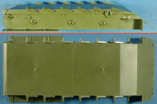 Besprechung:Einfacher aber nicht unattraktiver Bausatz. Die Teile haben keine sichtbaren Sinkstellen, sind aber mit etwas Grat behaftet. Also nichts was sich nicht beseitigen ließe. Die Detaillierung ist ausreichend. Auf den ersten Blick gesehen sollte man aber eventuell das Kunststoffteil für das Geschützrohr durch ein aus Metall gefertigtes ersetzen. Die Einzelgliederkette sieht recht gut aus, hat aber auf der Innenseite Auswerferstellen. Ob man diese nach dem Zusammenbau und dem Aufziehen der Kette aufs Fahrwerk noch sieht, wird der Bau des Modells zeigen. Sollten sie zu sehen sein, so ist hier Nacharbeit angesagt. Für die Reihenfolge der miteinander zu verklebenden einzelnen Teile findet man Hilfe auf den 6 Seiten der beiliegenden Bauanleitung. Diese ist in Russisch und Englisch gehalten, was aber nicht hinderlich ist. In 15 Schritten zeigen Explosivzeichnungen, was in welcher Reihenfolge wohin gehört. Hier gibt es auch die Farbangaben für die Bemalung von Teilen, die von der Tarnbemalung abweichen. Für das Tarnschema und die zu verwendenden Farben ist Seite 6 der Bauanleitung zuständig. Dort findet man dann auch die Platzierungshinweise für die Decals.