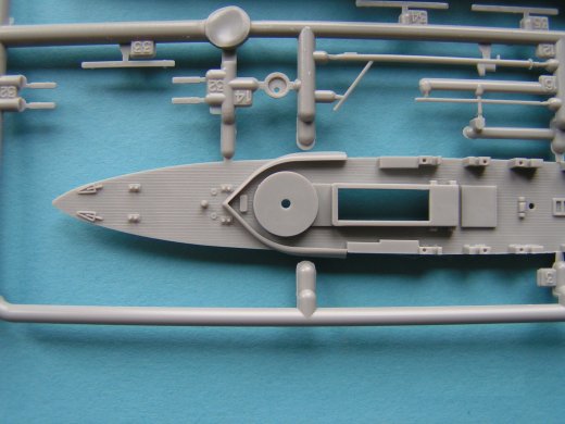 Die gute Qualität setzt sich an den Teilen für die Aufbauten fort. Brücke und Geschützturm als wesentliche Teile sind sehr gut wiedergegeben, was auch für die etlichen Kleinteile spricht, die zur weiteren Gestaltung des Brücken und Deckbereiches dienen. Hierzu zählen diverse Stützen, Scheinwerfer, Kompass sowie die Kasematten der seitlichen 120mm Geschütze. Ebenso weist das Haupt- und Brückendeck eine schöne Plankenstruktur auf. Die offene Brücke weist keine Reling bzw. Schanzkleider auf, hier sollte auf Ätzteile aus dem Zubehör zurückgegriffen werden - White Ensign, Eduard, Toms, Gold Medal Model o.ä. Der aus mehreren Teilen bestehende Hauptmast ist sehr schön wiedergegeben. Wer sein Modell allerdings mit einer Takelung versehen möchte, sollte den spritzgegossenen Mast besser durch einen Eigenbau aus Messing bzw. Stahldraht ersetzten.