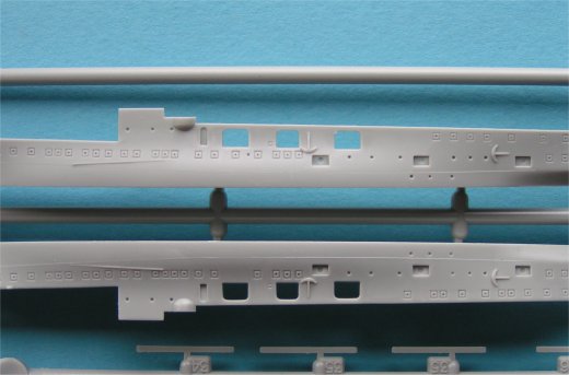 Doch nun zum Modell, im Bausatz sind jeweils zwei identische Gussäste mit den Teilen für den Bug und die Aufbauten enthalten. Zwei weitere, wiederum identische Gussäste enthalten Zurüstteile in Form von Lüftern, Booten etc. Diese scheinen als Standard in allen Sealsmodels Bausätzen enthalten zu sein. Der Guss der Teile und die Detaillierung ist richtig gut. Es finden sich keine Macken oder Auswerferspuren in den Sichtbereichen. Hier haben sich die Entwickler richtig Gedanken gemacht! Der Rumpf ist zweiteilig ausgeführt und es sind bereits wesentliche Strukturteile mit angegossen. Sogar der Anker samt Ankerkette ist mit angegossen und zeigt dabei eine gute Detailtreue.