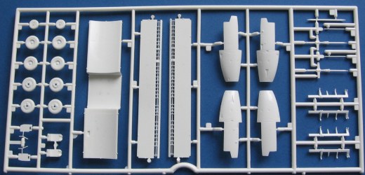TragflächenDie Abgasrohre der Triebwerke sind durchgängig in den Tragflächen vorhanden, perforierte Luftbremsen/Spoiler können optional aktiviert dargestellt werden. Die Propellerblätter sind leicht nach unten gewölbt, vermutlich wurden die Teile während der Produktion zu früh aus der Form genommen. Die Oberfläche ist feindetailliert und weist keinerlei Sinkstellen auf, jedoch erkennt man bereits am Gußast einen starken Verzug der Tragflächenenden. Diese wurden daher testweise montiert und schwächten den bisher vorherrschenden guten Eindruck des Modells sehr. Da alle vier Tragflächenteile einen verschieden starken Verzug aufweisen, verwinden sich unter Spannung verklebte Tragflächenenden unterschiedlich stark, was man bei montierten Sensorenpods besonders gut erkennen könnte. Wie weit man hier mit der Warmwassermethode gegen den Verzug arbeiten kann bleibt fraglich, da die Tragflächenteile eine relativ starke Wandstärke haben und natürlich auch ein entsprechend großer Behälter für die "Warmwasserkur" gefunden werden muß - ein einzelnes Tragflächenteil mißt 23,5cm.