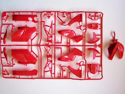 Besprechung:Zum Original:Das Dàntin Team kämpfte seit 1989 in der Spitzenklasse der Grand Prix Weltmeisterschaft mit. Ursprünglich Tochter-Team von Yamaha, wechselte man 2004 zu der italienischen Firma Ducati. Zusammen mit den neuen Maschinen kamen neue Fahrer, der Spanier Ruben Xaus und der Weltmeister Neil Hodgens. Obwohl es sich um Vorjahres-Maschinen des Typs Desmosedici handelte, wurde das Team 2004 mit einem 8. Endplatz in der Team-Wertung belohnt. 2005 wechselte das Team auf ein Einzelfahrer-System und verpflichtete Roberto Rolfo, einen Veteran der 250 ccm Klasse. Auch der italienische Maschinenbauer Pramac konnte als Sponsor gewonnen werden. Diese Vorjahresmaschine wurde mit dem augenfälligen Hibiskusblüten-Design ausgestattet. Durch die solide Leistung des Fahrers und des Supports von Ducati deutet alles auf eine glänzende Zukunft hin. Zum Modell:Das Modell gibt das Motorrad in allen Bereichen detailgetreu wieder. Besonders interessant ist der Gitterrohrrahmen und der Schwingarm, weche direkt am Motor befestigt werden und dem Original entsprechend nachgebildet wurden. Der Motor und die Vorderradgabel inkl. der Bremsanlage lassen keine Wünsche offen. Die Nacharbeit an den einzelnen Bauteilen beschränkt sich auf ein Minimum. Die Verkleidung ist nach Fertigstellung auch weiterhin demontierbar, sodass der Blick auf den Motor nicht versperrt bleibt. Auch der dem Bausatz beiliegende Montageständer des Motorrades ist zusammengebaut eine Augenweide.
