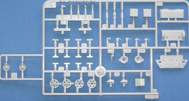 Besprechung:Die Gußqualität dieses Bausatzes war zunächst etwas verwirrend. Bei einem flüchtigen Blick auf die Gußäste sah alles sehr gut aus, der spätere Blick auf einzelne Teile wie Laufrollen und Treibräder erinnerte dann doch eher an sehr guten Shortrun. Im Endeffekt liegt dies aber nur an paar Gußhäuten und den nicht 100% symmetrischen Treibrädern des Laufwerks, die restlichen Teile überzeugen dagegen wieder durch zeitgemäße Detaillierung. So sind die Leiträder als einteilige Doppelhälften gegossen, auch die Ösen des Abschleppseils sind mit einer Öffnung für die beiliegende Schnur versehen. Die Treibstofftanks sind ebenfalls einteilig und zur Vermeidung von Sinkstellen innen hohl gegossen, mittels eines separaten Deckels können sie dann verschlossen werden.