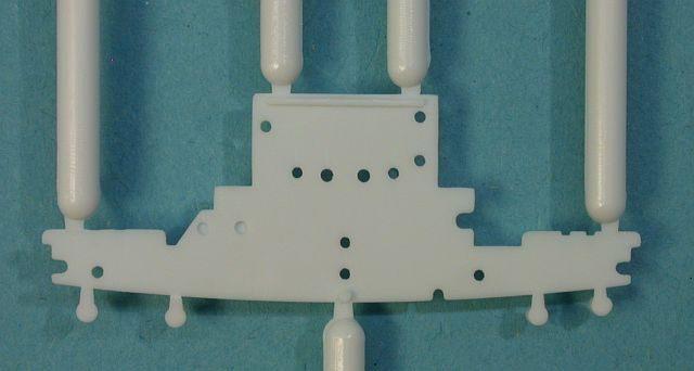 Der RumpfDer Rumpf besteht aus fünf Einzelteilen, zuzüglich mehrerer innerer Versteifungen. Alles ist sehr fein graviert und detailliert, die zahlreichen Klampen an der Schanzkleidkante könnten bei anderen Herstellern als Formfehler durchgehen, sind hier jedoch beabsichtigt. Die Bullaugen sind sauber eingetieft und haben feine Regenabweiser. Die Teilung des Rumpfes erfolgt nicht an der Wasserlinie, sondern entlang Nähten der sehr fein wiedergegebenen Rumpfplatten. Das bedeutet erhöhten Aufwand beim Zusammenbau und ein großes Risiko, die fein gravierten Details zu zerstören. Auf den Bau als Wasserlinienmodell ist Hasegawa nicht besonders eingegangen, was mir angesichts der geringen Abmessungen auch nicht als besonders kritisch erscheint. Die meisten der von uns verwendeten Basen bieten dem flachen Unterwasserrumpf genug Platz. Nur diejenigen unter uns, die ihre Wasserlinienmodelle auf Glasplatten präsentieren, werden hier leider ihr Tun haben.